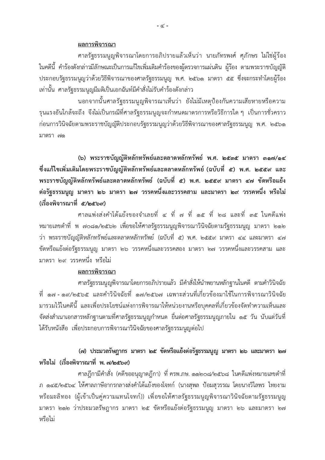 ศาลรัฐธรรมนูญพิจารณาโดยการอภิปรายแล้วเห็นว่า นายภัทรพงศ์ ไม่ใช่ผู้ร้องในคดีนี้ คำร้องดังกล่าวมีลักษณะเป็นการแก้ไขเพิ่มเติมคำร้องของผู้ตรวจการแผ่นดิน ผู้ร้อง ตามพระราชบัญญัติประกอบรัฐธรรมนูญ (พ.ร.ป.) ว่าด้วยวิธีพิจารณาของศาลรัฐธรรมนูญ พ.ศ. 2561 มาตรา 55 ซึ่งจะกระทำโดยผู้ร้องเท่านั้น ศาลรัฐธรรมนูญมีมติเป็นเอกฉันท์มีคำสั่งไม่รับคำร้องดังกล่าว