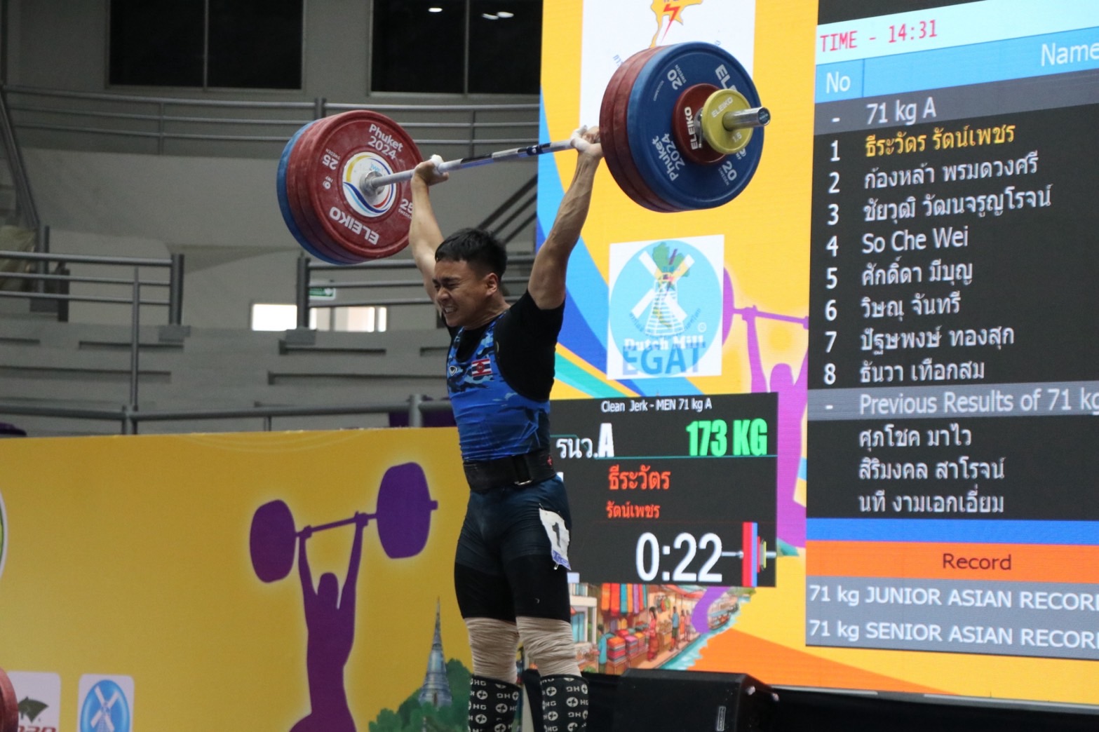 - ธีระวัตร รัตน์เพชร จากสโมสรราชนาวี เอ กวาด 3 เหรียญทอง ท่าสแนทช์ 137 กิโลกรัม, ท่าคลีนแอนด์เจิร์ก 173 กิโลกรัม, น้ำหนักรวม 310 กิโลกรัม