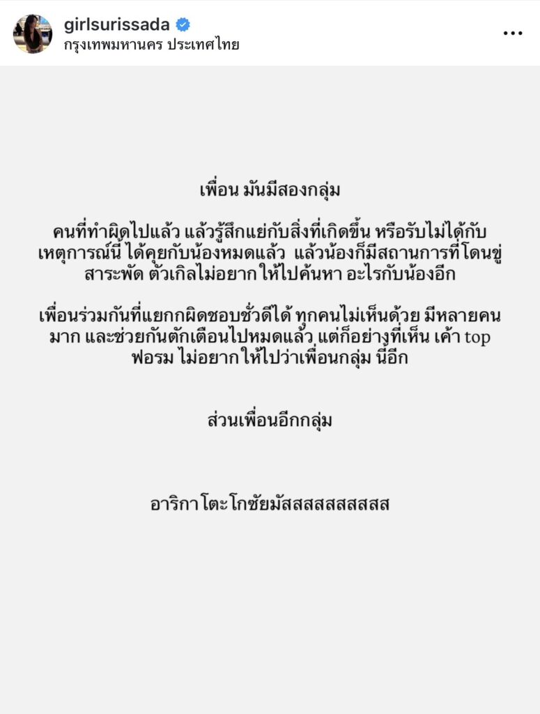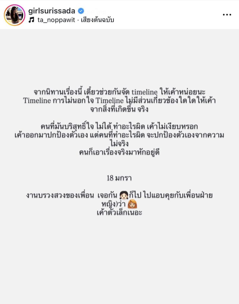 “จากนิทานเรื่องนี้ เดี๋ยวช่วยกันจัด timeline ให้เค้าหน่อยนะ Timeline การไม่นอกใจ Timeline ไม่มีส่วนเกี่ยวข้องใดใดให้เค้าจากสิ่งที่เกิดขึ้น จริง คนที่มันบริสุทธิ์ใจ ไม่ได้ ทำอะไรผิด เค้าไม่เงียบหรอก เค้าออกมาปกป้องตัวเอง แต่คนที่ทำอะไรผิด จะปกป้องตัวเองจากความ