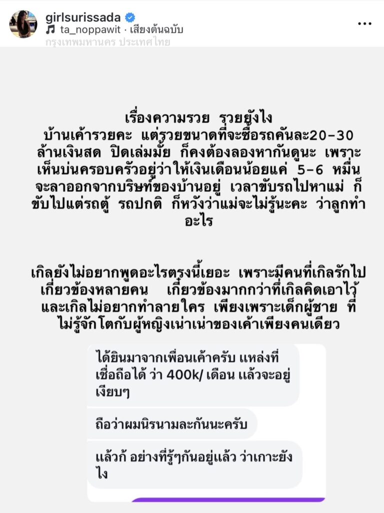 เรื่องความรวย รวยยังไง บ้านเค้ารวยคะ แต่รวยขนาดที่จะซื้อรถคันละ20-30 ล้านเงินสด ปิดเล่มมั้ย ก็คงต้องลองหากันดูนะ เพราะ เห็นบ่นครอบครัวอยู่ว่าให้เงินเดือนน้อยแค่ 5-6 หมื่น จะลาออกจากบริษท์ของบ้านอยู่ เวลาขับรถไปหาแม่ ก็ขับไปแต่รถตู้ รถปกติ ก็หวังว่าแม่จะไม่รู้นะคะ ว่าลูกทำ อะไร เกิลยังไม่อยากพูดอะไรตรงนี้เยอะ เพราะมีคนที่เกิลรักไป เกี่ยวข้องหลายคน เกี่ยวข้องมากกว่าที่เกิลคิดเอาไว้ และเกิลไม่อยากทำลายใคร เพียงเพราะเด็กผู้ชาย ที่ ไม่รู้จักโตกับผู้หญิงเน่าเน่าของเค้าเพียงคนเดียว“