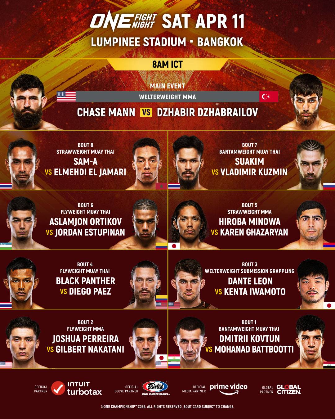 เปิดโปรแกรมเต็มศึก ONE Fight Night 42 ที่จะถ่ายทอดสดจากสนามมวยเวทีลุมพินี (รามอินทรา) ไปยัง 195 ประเทศทั่วโลก ในช่วงไพรม์ไทม์อเมริกา ตรงกับเวลา 08.00 น. ของวันเสาร์ที่ 11 เม.ย.นี้ ตามเวลาประเทศไทย โดยคู่เอก เป็นการพบกันของสองสุดยอดนักสู้ในกติกาการต่อสู้แบบผสมผสาน (MMA) ระหว่าง “เชส แมนน์” จากสหรัฐอเมริกา ปะทะ “จาบีร์ จาเบรลอฟ” จากตุรกี ร่วมด้วยการตบเท้าขึ้นสังเวียนของ 3 นักชกไทย ได้แก่ “สามเอ ไก่ย่างห้าดาว”, “เสือคิม ป๋องสุพรรณ พีเค.” หรือชื่อเดิม “เสือคิม สจ.โต้งปราจีน” และ “แบล็คแพนเธอร์” พร้อมด้วยทัพนักสู้ระดับพระกาฬที่เข้าร่วมชิงชัยคับคั่ง