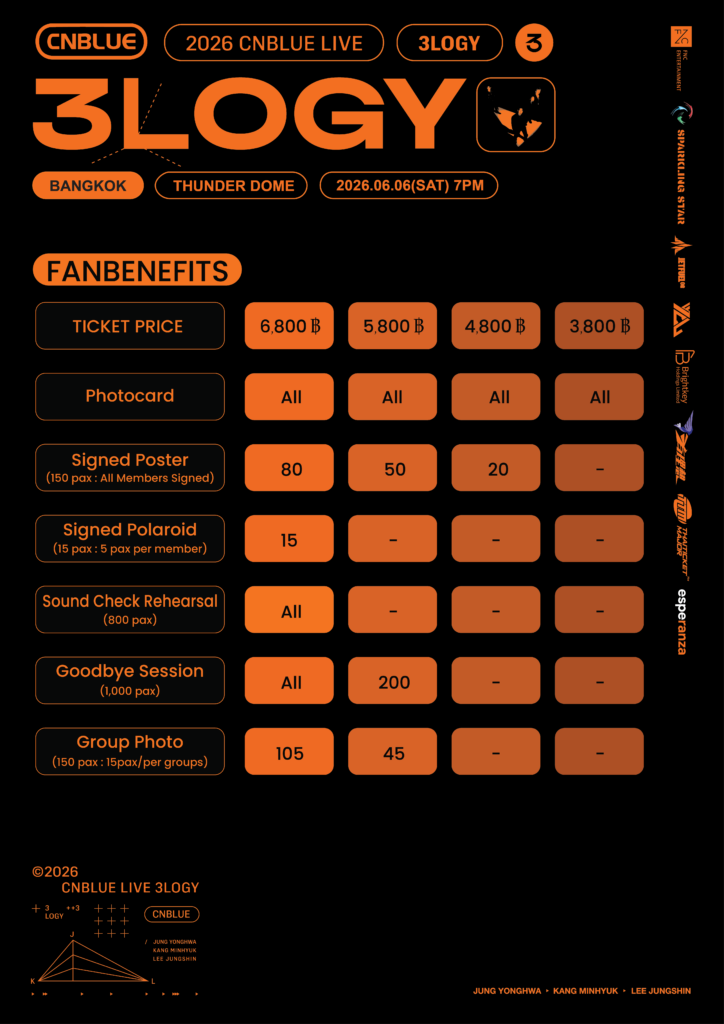 สำหรับใครที่ไม่อยากพลาดโมเมนต์ประวัติศาสตร์ในครั้งนี้ 2026 CNBLUE LIVE WORLD TOUR ‘3LOGY’ IN BANGKOK รับจับจองบัตรด่วน!! เปิดจำหน่ายบัตรแล้วผ่านทาง www.thaiticketmajor.com ราคาบัตร 6,800 / 5,800 / 4,800 / 3,800 บาท ใครที่ยังไม่มีบัตรในมือขอเตือนเลยว่าอย่าลังเล เพราะโอกาสที่จะได้ใกล้ชิดกับพวกเขาระดับนี้ไม่ได้มีบ่อยๆ อย่าปล่อยให้โอกาสหลุดมือไป แล้วมาพบกันที่หน้าเวที! ติดตามละเอียดเพิ่มเติมได้ทาง Facebook: @Jetfuel , X: @jetfuelogMusic และ Instagram: @jetfuelog_musicpublishing