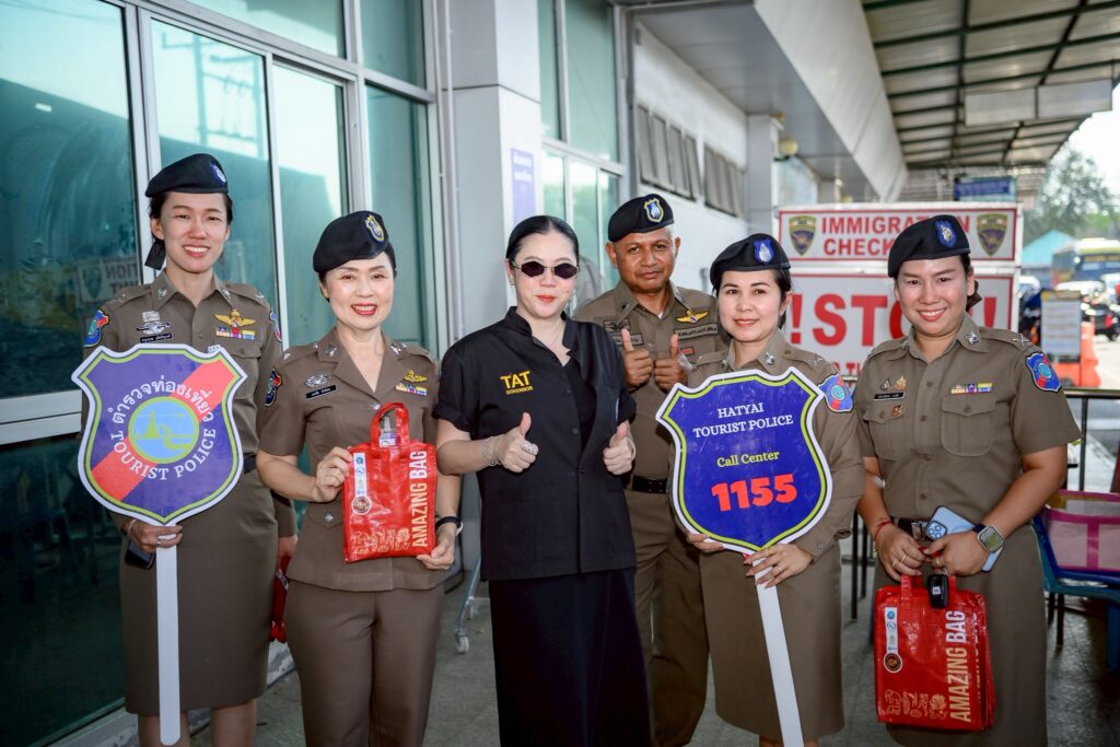 นางสาวฐาปนีย์ เกียรติไพบูลย์ ผู้ว่าการ ททท. พร้อมด้วย นายณัฐ ครุฑสูตร รองผู้ว่าการด้านสินค้าและธุรกิจท่องเที่ยว ททท. และนางสาว ณัฐพรรณ ตรีเดชา ผู้อำนวยการฝ่ายส่งเสริมการลงทุนอุตสาหกรรมท่องเที่ยว ททท. พร้อมด้วยผู้แทนพันธมิตรภาครัฐและเอกชน ร่วมให้การต้อนรับนักท่องเที่ยวขาเข้าจากต่างประเทศ พร้อมมอบของขวัญ “Amazing Bag” ซึ่งบรรจุของที่ระลึกเสน่ห์ไทย เพื่อสร้างความประทับใจตั้งแต่ก้าวแรกที่เดินทางมาถึงประเทศไทย ณ ท่าอากาศยานนานาชาติหาดใหญ่ และด่านศุลกากรสะเดา