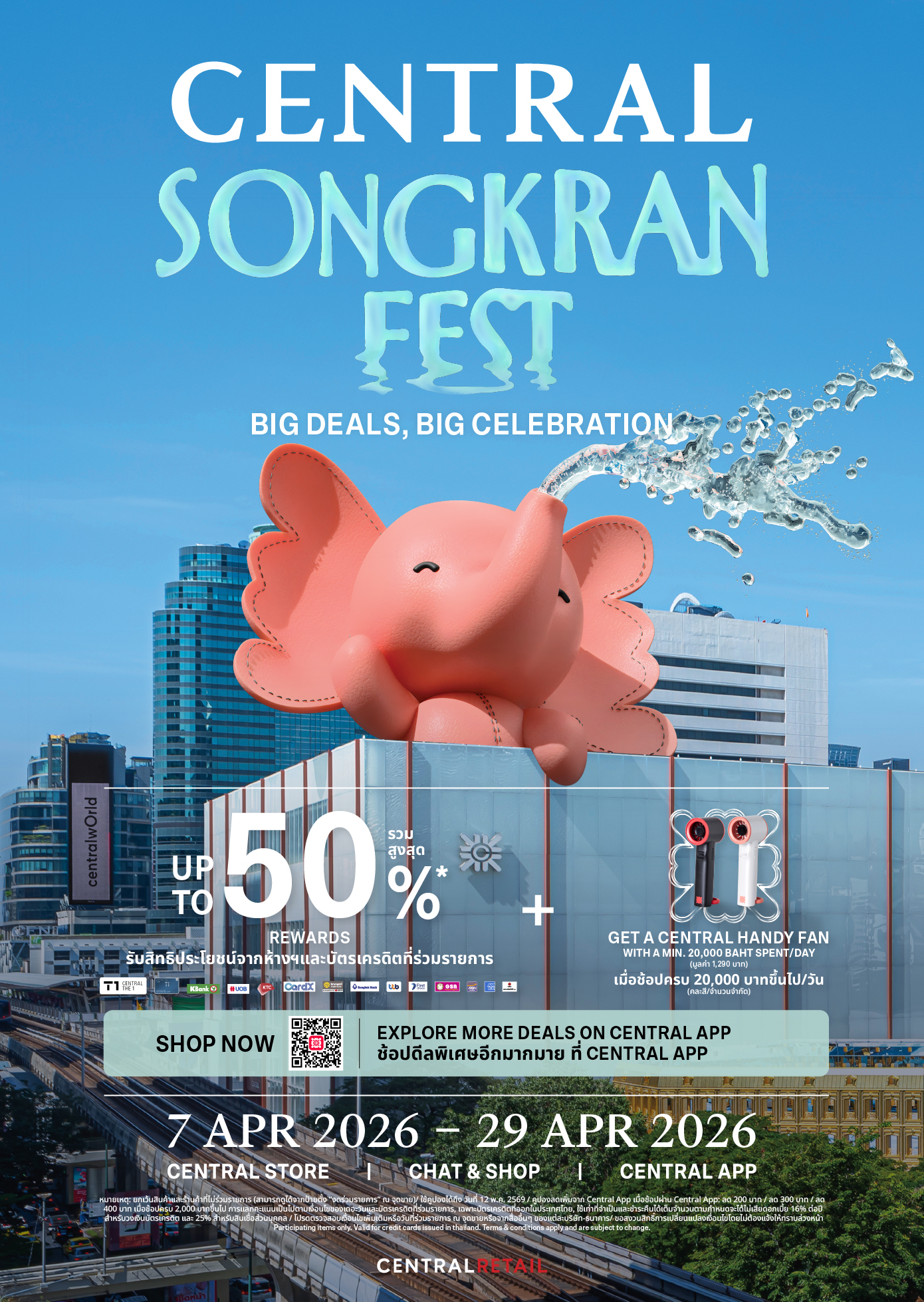 สัมผัสประสบการณ์ช้อป-กิน-เที่ยว ตลอดเดือนเมษายนไปกับ “CENTRAL SONGKRAN FEST” ที่ห้างเซ็นทรัลชิดลม ระหว่างวันที่ 7–29 เมษายน 2569 และที่ศูนย์การค้าเซ็นทรัล เอ็มบาสซีระหว่างวันที่ 7–19 เมษายน 2569 พร้อมกิจกรรม สุดพิเศษมากมายที่รวบรวมครบทุกมิติของการเฉลิมฉลอง ทั้งเทศกาลปีใหม่ไทย และเทศกาลอีสเตอร์ ระหว่างวันที่ 4-6 เมษายน 2569 พร้อมช้อปเซ็นทรัลแอป และทุกช่องทางการช้อป ทั้งเว็บไซต์ www.central.co.th, Central Chat & Shop ช้อปและแชตผ่านไลน์ @Centralofficial รวมถึงช้อปผ่านเฟซบุ๊กที่ Facebook page: Central Department Store