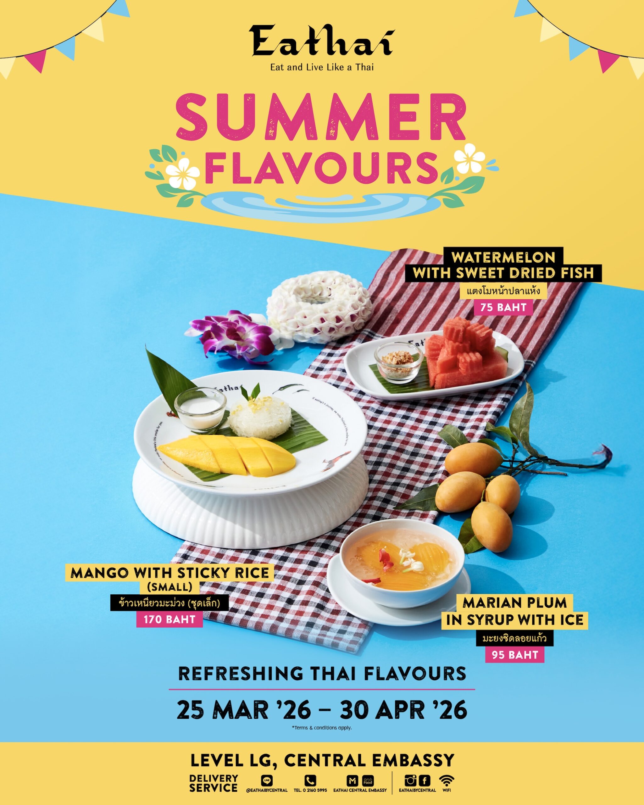 เติมเต็มความสนุกด้วยความอร่อย ความสดชื่นพร้อมบรรยากาศสนุกที่ Eathai ชั้น LG เสริมสิริมงคลด้วย กิจกรรม สรงน้ำพระ วันที่ 10 – 15 เมษายน 2569 เติมเต็มความสนุกโดย Live DJ TukTuk Radio วันที่ 12 – 13 เมษายน 2569 เวลา 12.00 – 14.00 น. และ 17.00 – 19.00 น. สดชื่นรับหน้าร้อนกับ Summer Flavours เสิร์ฟเมนูไทยคลายร้อนสุดพิเศษ อย่างแตงโมหน้าปลาแห้ง ข้าวเหนียวมะม่วง และมะยงชิดลอยแก้ว ตลอดเดือน และพลาดไม่ได้กับความอร่อยสุดเอ็กซ์คลูซีฟ เพียงสั่งอาหารและเครื่องดื่มครบ 400 บาทต่อใบเสร็จ รับฟรี! “ขนมชั้นลายผ้าไทย” ที่สะท้อนเอกลักษณ์วัฒนธรรมไทย (จำนวนจำกัด 60 สิทธิ์) วันที่ 12 – 14 เมษายน 2569