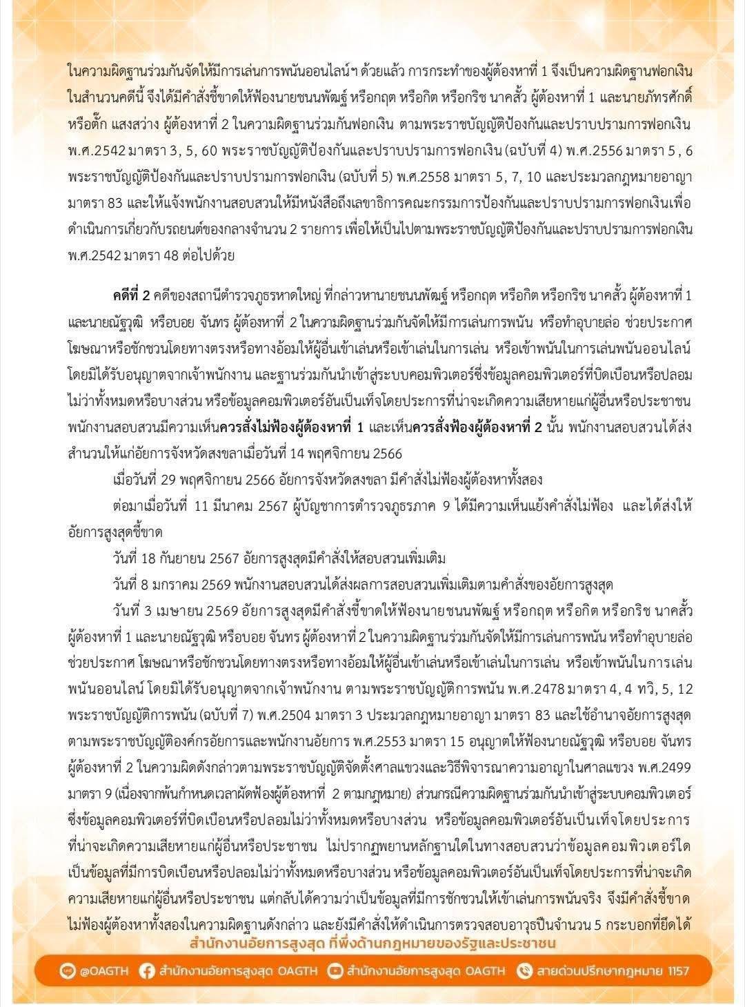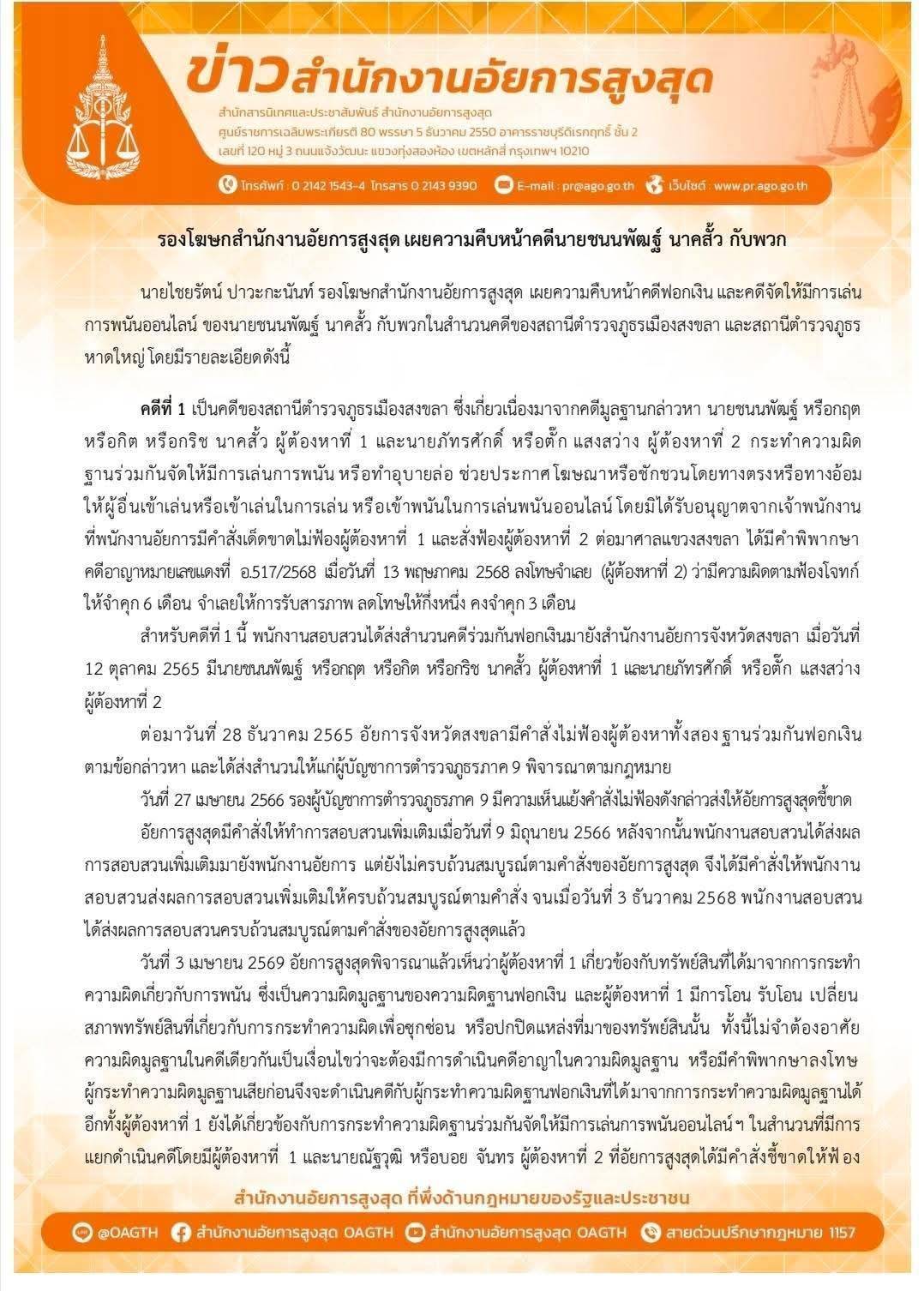 นายไชยรัตน์ ปาวะกะนันท์ รองโฆษกสำนักงานอัยการสูงสุด เผยความคืบหน้าคดีฟอกเงิน และคดีจัดให้มีการเล่นการพนันออนไลน์ ของนายชนนพัฒฐ์ นาคสั้ว กับพวกในสำนวนคดีของสถานีตำรวจภูธรเมืองสงขลาและสถานีตำรวจภูธรหาดใหญ่ โดยมีรายละเอียดดังนี้
