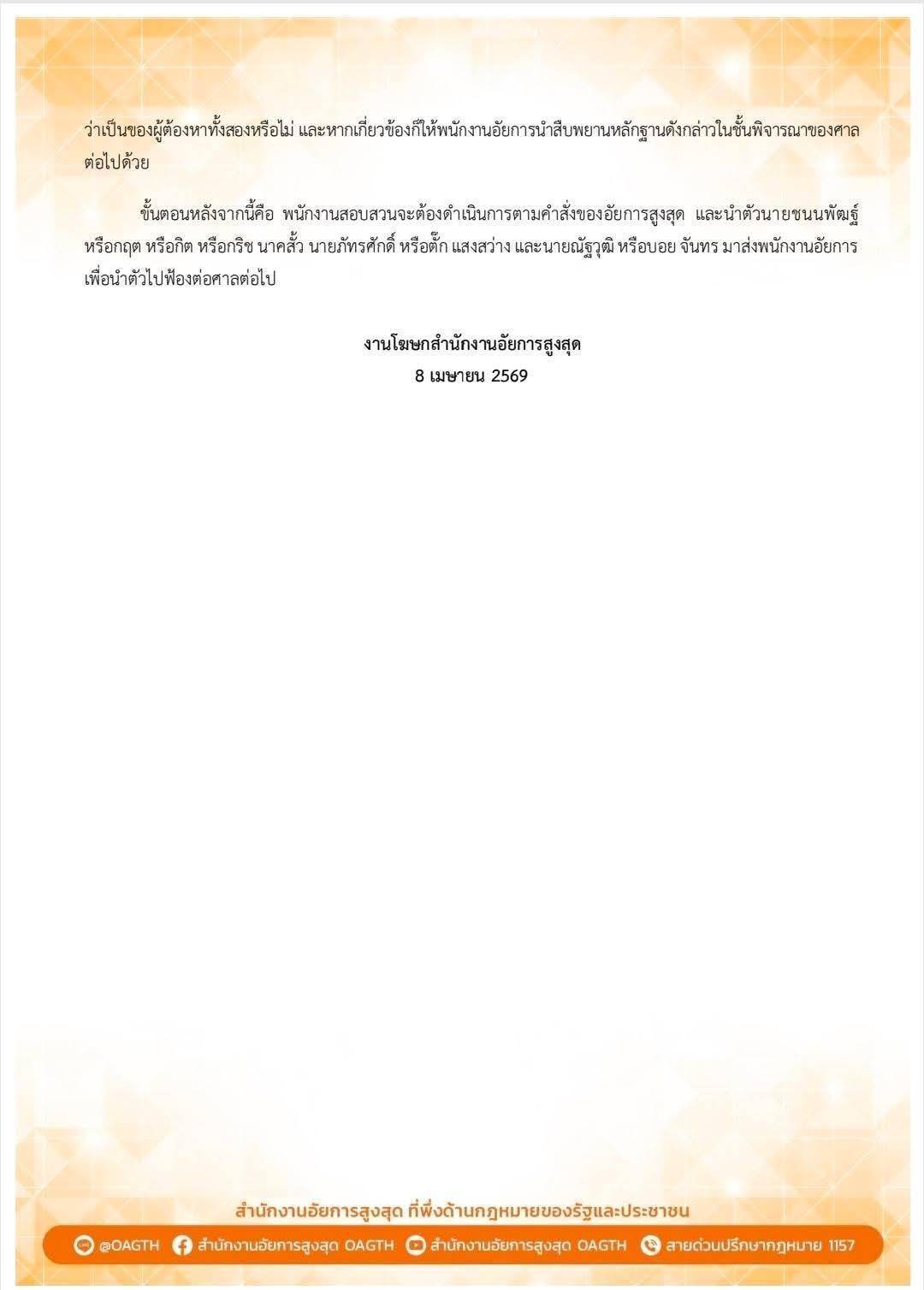 วันที่ 3 เมษายน 2569 อัยการสูงสุดพิจารณาแล้วเห็นว่าผู้ต้องหาที่ 1 เกี่ยวข้องกับทรัพย์สินที่ได้มาจากการกระทำความผิดเกี่ยวกับการพนัน ซึ่งเป็นความผิดมูลฐานของความผิดฐานฟอกเงิน และผู้ต้องหาที่ 1 มีการโอน รับโอนเปลี่ยนสภาพทรัพย์สินที่เกี่ยวกับการกระทำความผิดเพื่อซุกซ่อน หรือปกปิดแหล่งที่มาของทรัพย์สินนั้น
