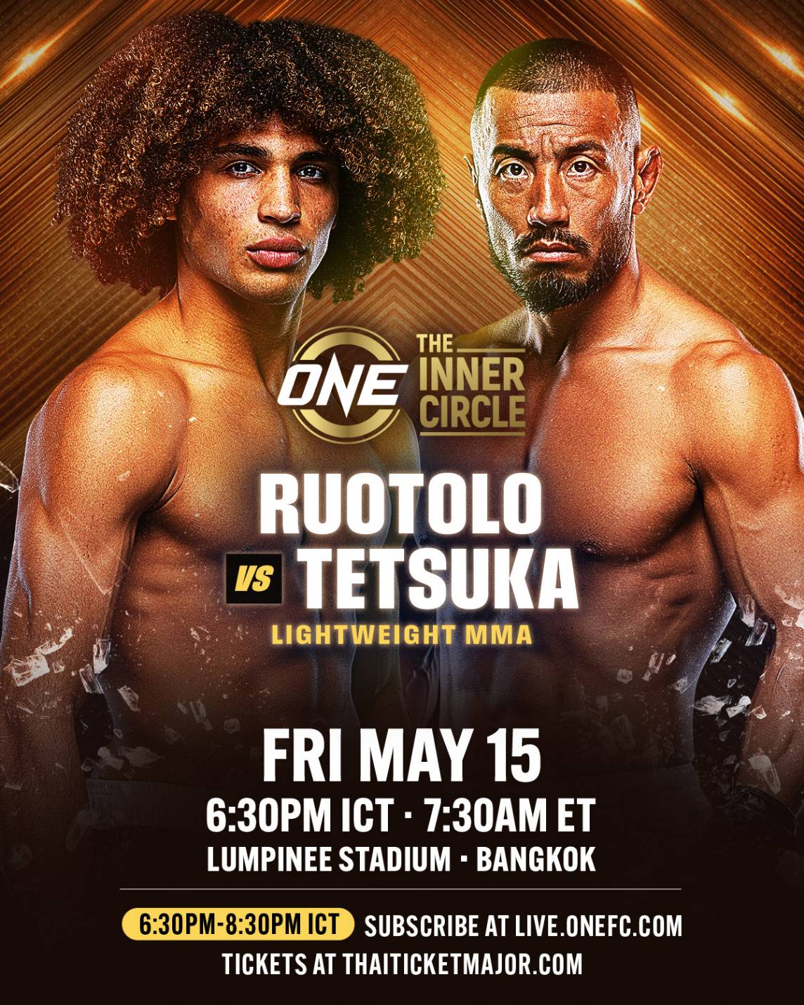 เปิดหัวความมันสำหรับรายการ The Inner Circle ที่จะลุยบู๊ ณ สนามมวยเวทีลุมพินี (รามอินทรา) ในวันศุกร์ที่ 15 พ.ค. 69 ถ่ายทอดสดส่งตรงไปยัง 195 ประเทศทั่วโลก ในช่วงเวลา 18.30 น. – 20.30 น. โดยประกบ “เคด รูโทโล” แชมป์โลก ONE ปล้ำจับล็อก รุ่นไลต์เวต (155-170 ป.) วัย 23 ปี จากสหรัฐอเมริกา สานต่อความแรงในเส้นทางการต่อสู้แบบผสมผสาน (MMA) วัดฝีมือกับ “ฮิโรยูกิ เทตซูกะ” จอมแกร่งลีลาเก๋า วัย 36 ปี จากญี่ปุ่น ในกติกา MMA รุ่นไลต์เวต