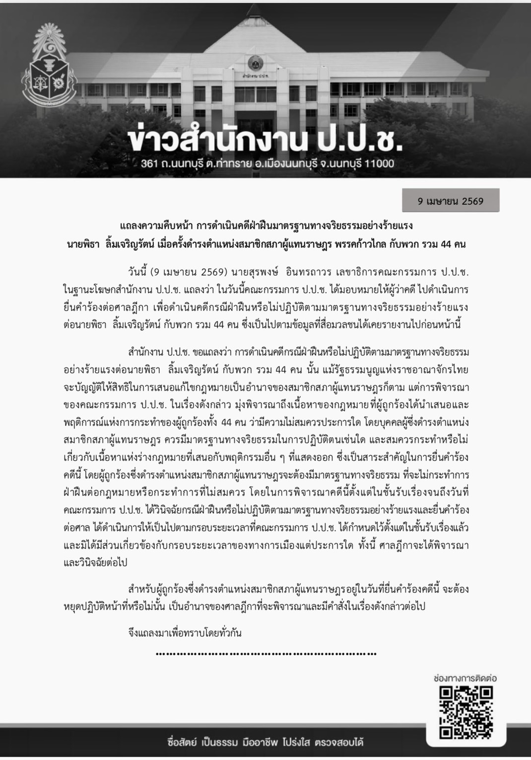สำนักงาน ป.ป.ช. ขอแถลงว่า การดำเนินคดีกรณีฝ่าฝืนหรือไม่ปฏิบัติตามมาตรฐานทางจริยธรรม อย่างร้ายแรงต่อนายพิธา ลิ้มเจริญรัตน์ กับพวก รวม 44 คน นั้น แม้รัฐธรรมนูญแห่งราชอาณาจักรไทย จะบัญญัติให้สิทธิในการเสนอแก้ไขกฎหมายเป็นอำนาจของสมาชิกสภาผู้แทนราษฎรก็ตาม แต่การพิจารณาของคณะกรรมการ ป.ป.ช. ในเรื่องดังกล่าว มุ่งพิจารณาถึงเนื้อหาของกฎหมายที่ผู้ถูกร้องได้นำเสนอ และพฤติการณ์แห่งการกระทำของผู้ถูกร้องทั้ง 44 คน ว่า มีความไม่สมควรประการใด