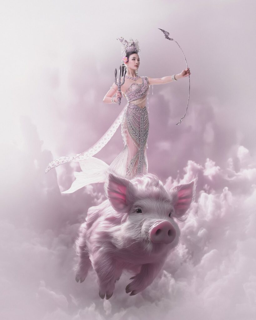 แต่สิ่งที่ถูกพูดถึงมากที่สุด คงหนีไม่พ้น “หมูสีชมพูบินได้” ที่เธอยืนอยู่ด้านบน ยิ่งเพิ่มความแฟนตาซีและความโดดเด่นให้ภาพนี้น่าจับตามองขึ้นไปอีก