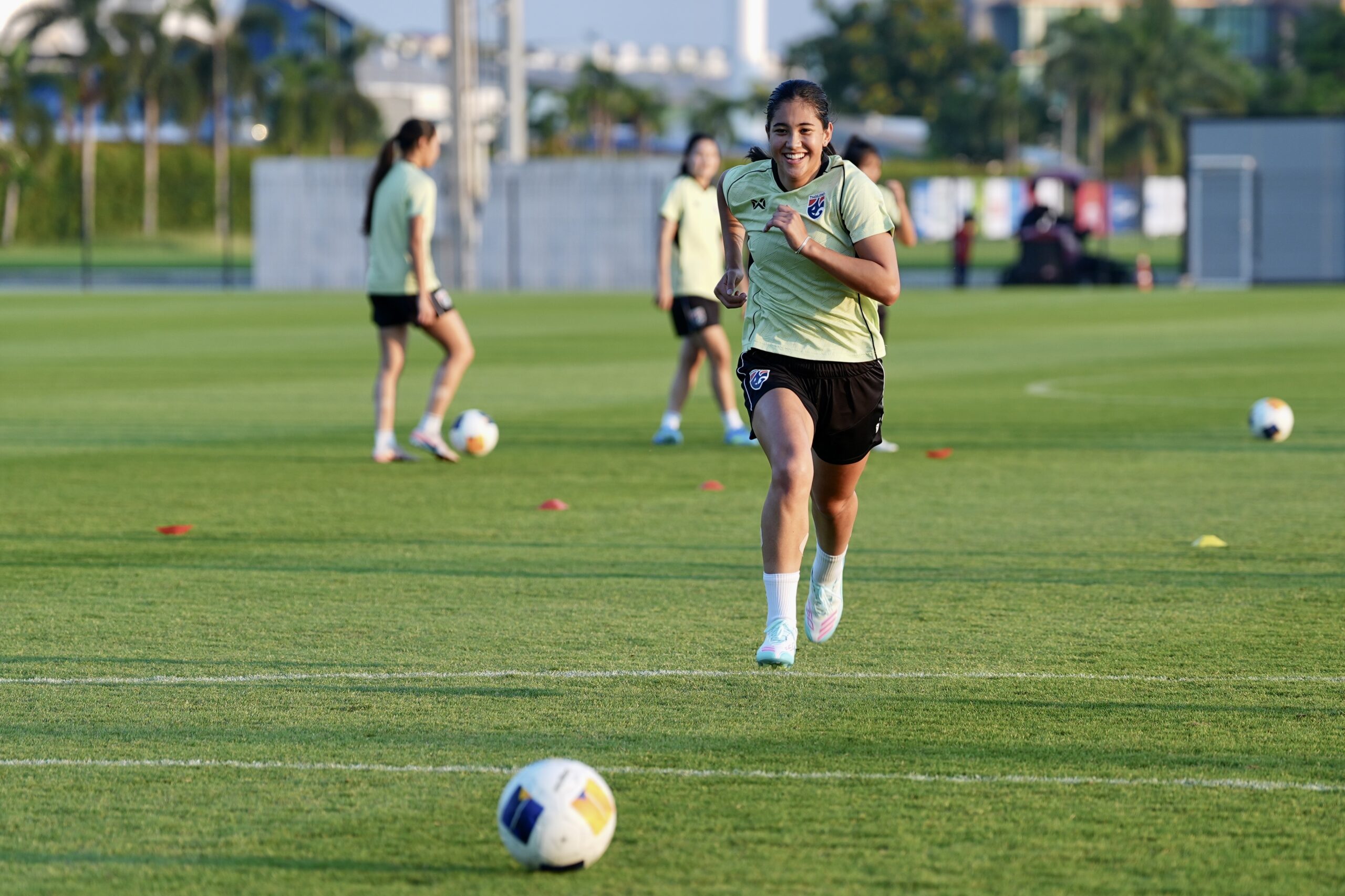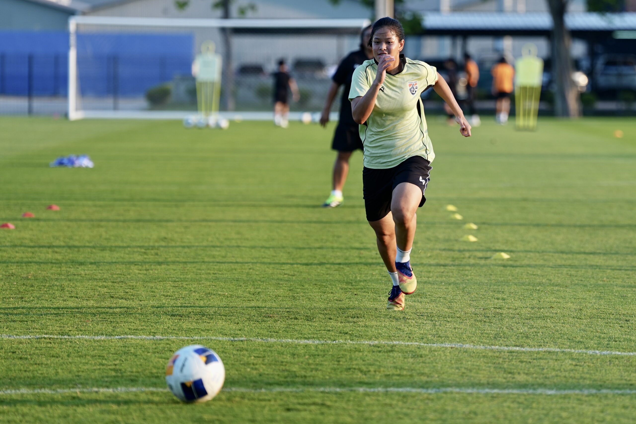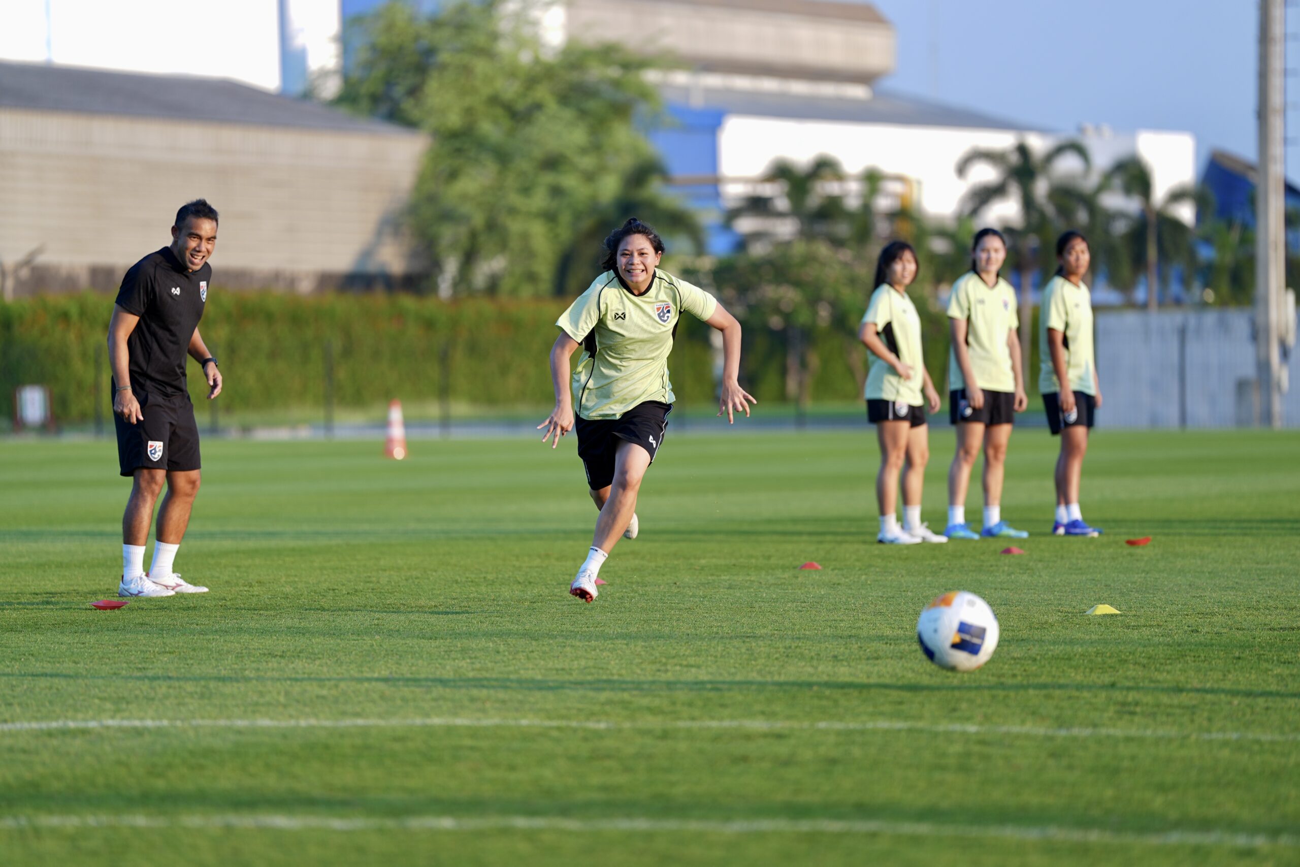การฝึกซ้อมครั้งนี้ “โค้ชหนึ่ง” หนึ่งฤทัย สระทองเวียน หัวหน้าผู้ฝึกสอน นำทัพติวเข้ม โดยเน้นไปที่การลงรายละเอียดแทคติกทั้งเกมรุกและเกมรับ รวมถึงการเล่นลูกตั้งเตะและลูกเตะมุม ซึ่งใช้เวลา 1 ชั่วโมง 30 นาที