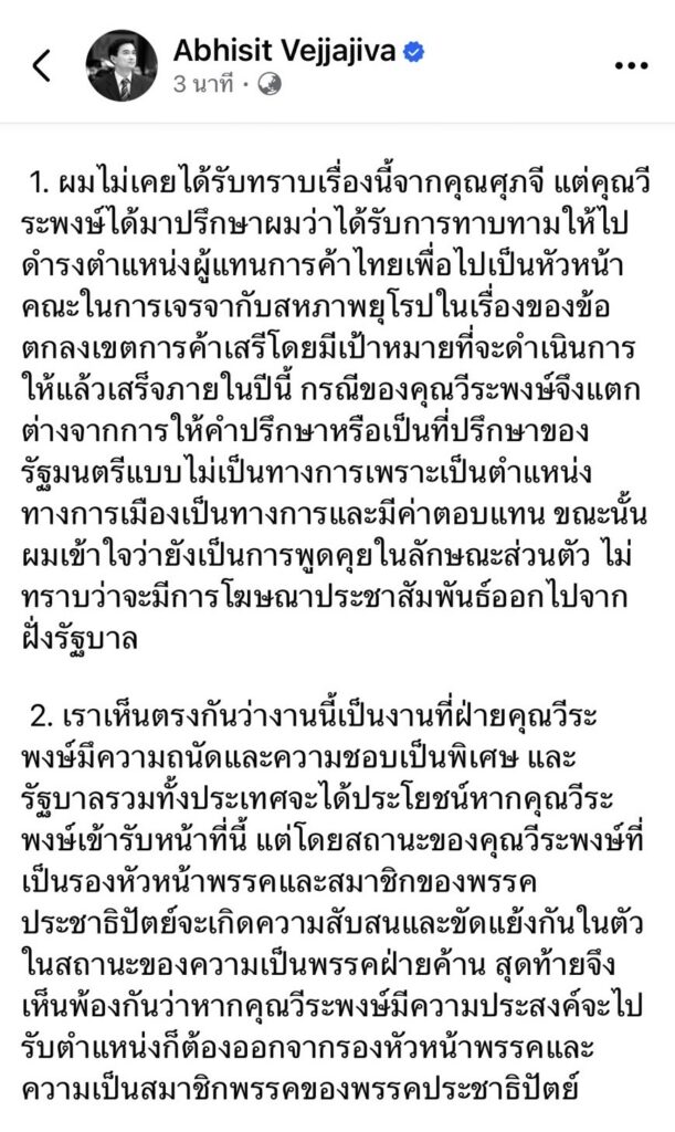 นายอภิสิทธิ์ เวชชาชีวะ หัวหน้าพรรคประชาธิปัตย์ ชี้แจงกรณีที่นายวีระพงษ์ ประภา รองหัวหน้าพรรคฯ ในฐานะอดีตผู้แทนการค้าไทย ได้รับการแต่งตั้งจากนางศุภจี สุธรรมพันธุ์ รองนายกรัฐมนตรีและรัฐมนตรีว่าการกระทรวงพาณิชย์ เป็นคณะที่ปรึกษาของรองนายกรัฐมนตรีและรัฐมนตรีว่าการกระทรวงพาณิชย์ และการโต้เถียงวิพากษ์วิจารณ์ในวงกว้างว่า ตนไม่เคยได้รับทราบเรื่องนี้จากนางศุภจี แต่นายวีระพงษ์ ได้มาปรึกษาตนว่า ได้รับการทาบทามให้ไปดำรงตำแหน่งผู้แทนการค้าไทย เพื่อไปเป็นหัวหน้าคณะในการเจรจากับสหภาพยุโรป ในเรื่องของข้อตกลงเขตการค้าเสรีโดยมีเป้าหมายที่จะดำเนินการให้แล้วเสร็จภายในปีนี้ และในกรณีของนายวีระพงษ์ จึงแตกต่างจากการให้คำปรึกษา หรือเป็นที่ปรึกษาของรัฐมนตรีแบบไม่เป็นทางการ เพราะเป็นตำแหน่งทางการเมือง เป็นทางการและมีค่าตอบแทน
