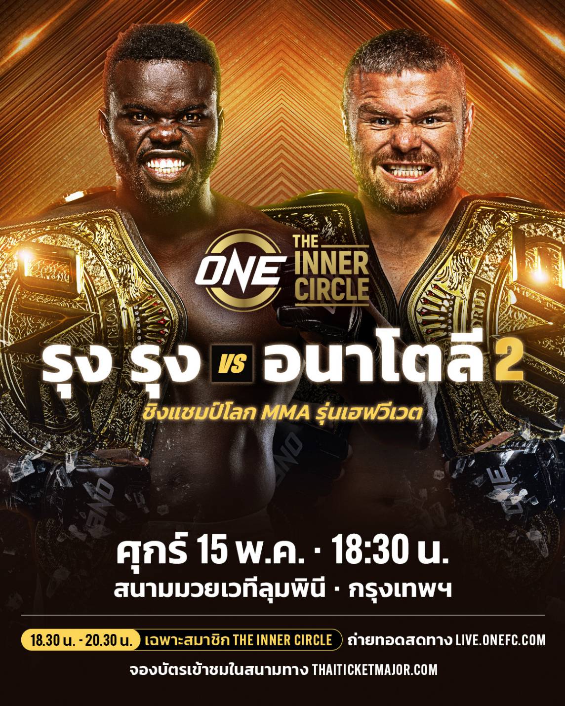 ติดตาม “รุง รุง vs อนาโตลี” วันศุกร์ที่ 15 พ.ค. นี้ จองบัตรเข้าชมในสนามผ่านทาง THAI TICKET MAJOR  สำหรับผู้ชมทางบ้าน สามารถรับชมการถ่ายทอดสด The Inner Circle ในช่วงเวลา 18.30 น. – 20.30 น. ทาง LIVE.ONEFC.com สงวนสิทธิ์เฉพาะสมาชิกเท่านั้น ดูรายละเอียดการสมัครสมาชิกได้ที่ลิงก์นี้ ONEFC.com