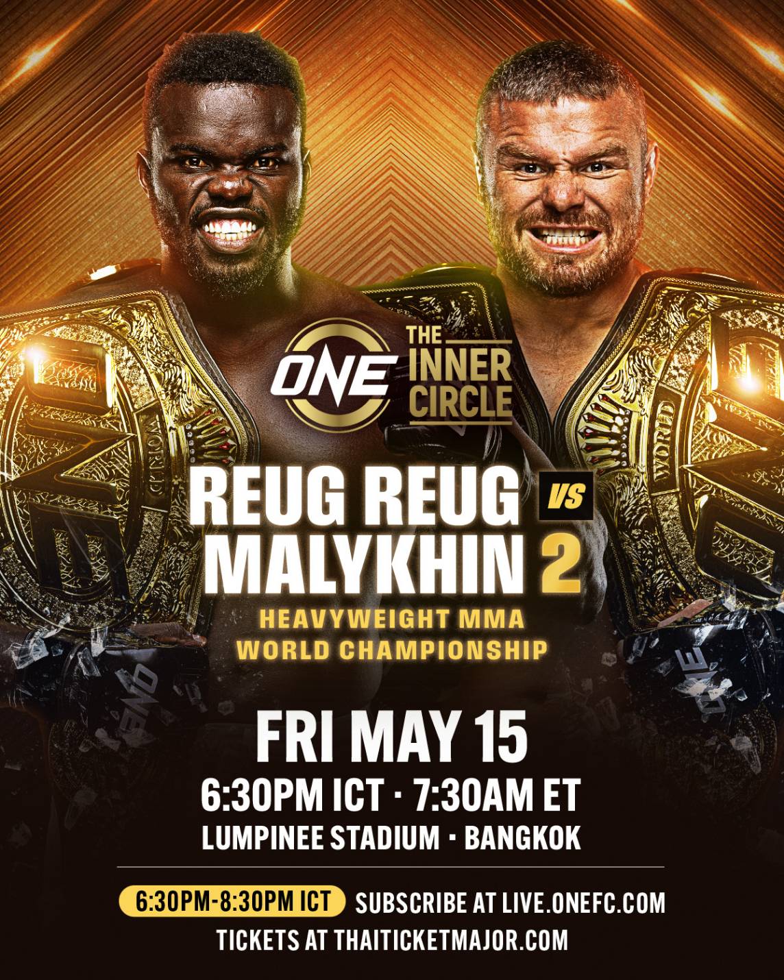 เปิดโปรแกรมสุดมันระดับเวิลด์คลาส สำหรับรายการ The Inner Circle ที่จะเปิดฉาก ณ สนามมวยเวทีลุมพินี (รามอินทรา) ในวันศุกร์ที่ 15 พ.ค. นี้ ถ่ายทอดสดเฉพาะสมาชิกทาง Live.ONEFC.com ตั้งแต่เวลา 18.30 น.- 20.30 น. โดย “รุง รุง” อูมาร์ คาน แชมป์โลก ONE MMA รุ่นเฮฟวีเวต (225-265 ป.) วัย 34 ปี จากเซเนกัล ขึ้นป้องกันบัลลังก์จาก “อนาโตลี มาลีคิน” คู่ปรับเก่าเจ้าของแชมป์โลก ONE MMA รุ่นมิดเดิลเวต (185-205 ป.), รุ่นไลต์เฮฟวีเวต (205-225 ป.) วัย 38 ปี ชาวรัสเซีย