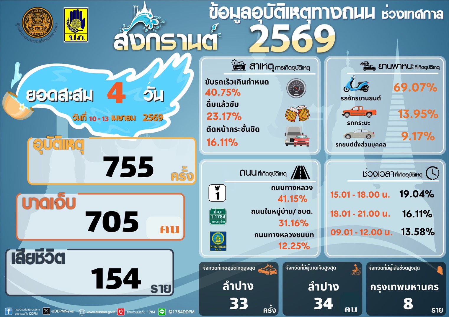 สรุปอุบัติเหตุทางถนนสะสมในช่วง 4 วันของการรณรงค์ (10 – 13 เม.ย. 69) เกิดอุบัติเหตุรวม 755 ครั้ง ผู้บาดเจ็บ รวม 705 คน ผู้เสียชีวิต รวม 154 ราย จังหวัดที่เกิดอุบัติเหตุสะสมสูงสุดได้แก่ ลำปาง (33 ครั้ง) จังหวัดที่มีผู้บาดเจ็บสะสมสูงสุด ได้แก่ ลำปาง (34 คน) จังหวัดที่มีผู้เสียชีวิตสะสมสูงสุด ได้แก่ กรุงเทพมหานคร (8 ราย) จังหวัดที่ไม่มีผู้เสียชีวิต (ตายเป็นศูนย์) มี 22 จังหวัด