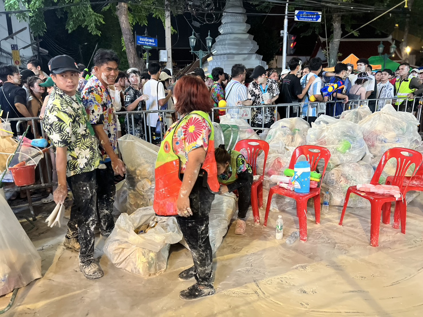 โดยที่บริเวณประตูทางเข้าฝั่ง ถ.จักพงษ์ เต็มไปด้วยบรรดานักท่องเที่ยวจํานวนมาก แต่ยังไม่ถึงขั้นต้องปิดประตูทางเข้าเนื่องจากเจ้าหน้าที่ยังสามารถเร่งระบายคนออกจากพื้นที่ได้เนื่องด้วยที่ ถ.ข้าวสาร จัดให้เล่นนํ้าแบบ ONE WAY คือเข้าและออกทางเดียว โดยมีเจ้าหน้าที่ตํารวจคอยดูแลรักษาความปลอดภัยพร้อมสร้างสีสรรค์ร่วมเล่นนํ้ากับนักท่องเที่ยวสร้างความประทับใจให้ชาวต่างชาติเป็นอย่างมาก