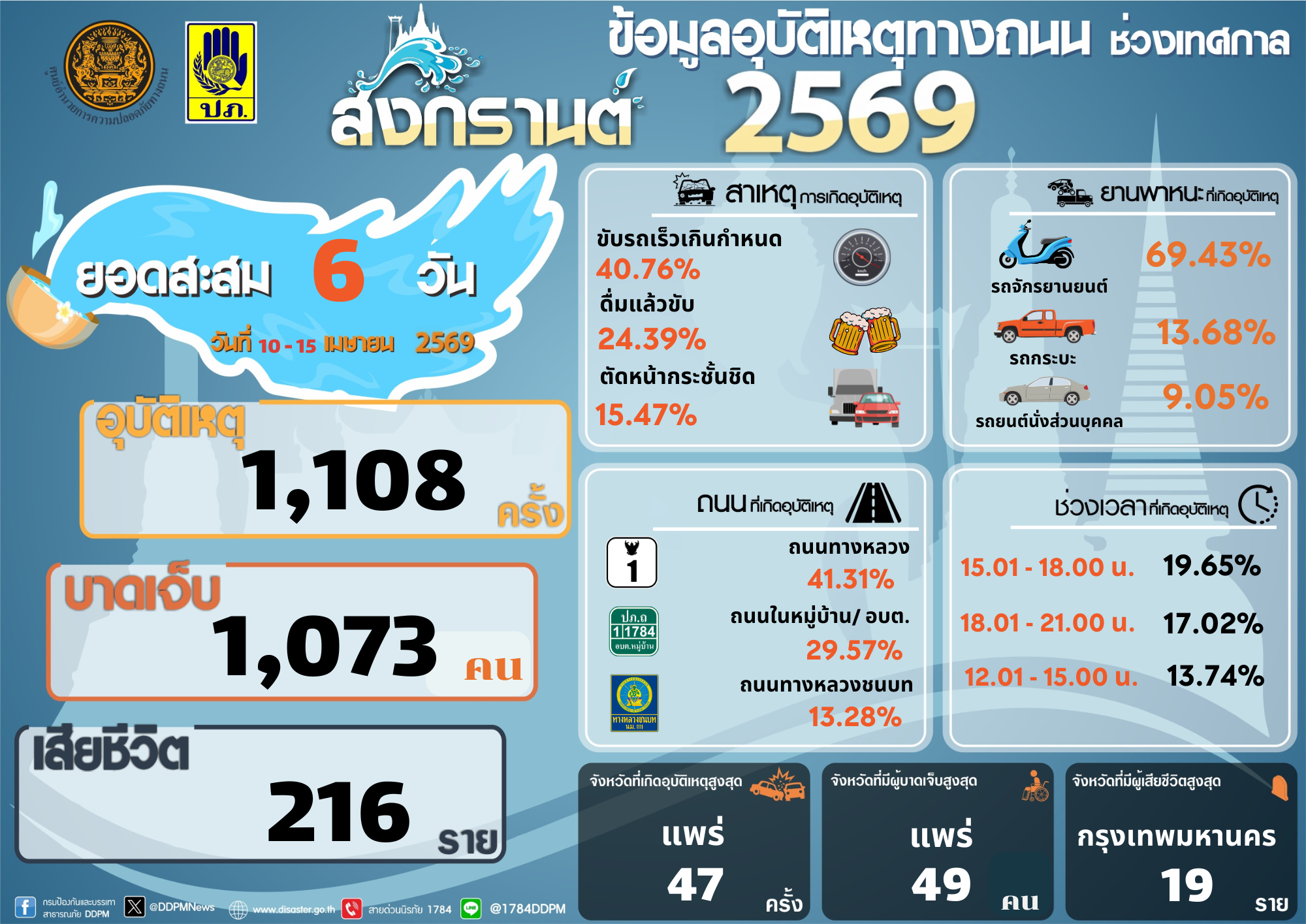 ทั้งนี้ สรุปรวมเกิดตัวเลข 6 วัน 10-15 เมษายน 2569 ของการรณรงค์ เกิดอุบัติเหตุ 1,108 ครั้ง ผู้บาดเจ็บ 1,073 คน ผู้เสียชีวิต 216 ราย , จังหวัดที่เกิดอุบัติเหตุสะสมสูงสุดคือ แพร่ 47 ครั้งลำปางเชียงราย จังหวัด 36 ครั้ง สงขลา สุพรรณบุรี จังหวัดละ 34 ครั้ง , จังหวัดที่มีผู้บาดเจ็บสูงสุด คือ แพร่ 49 คน น่าน ลำปาง จังหวัดละ 37 คน เชียงราย 36 คน , จังหวัดที่มีผู้เสียชีวิตสูงสุดคือกรุงเทพมหานคร 19 ราย ปทุมธานี 10 ราย นครราชสีมา ปราจีนบุรี พิษณุโลก สกลนคร และสงขลา จังหวัดละ 7 ราย