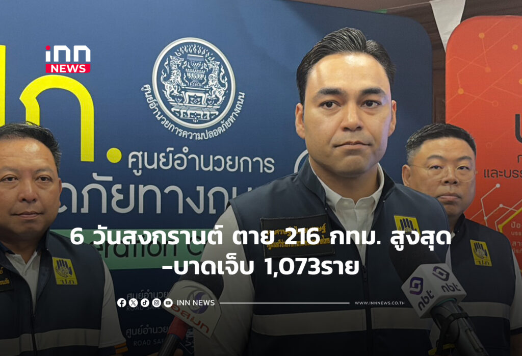 6 วันสงกรานต์ ตาย 216 กทม. แชมป์สูงสุด เจ็บ 1,073 สาเหตุขับรถเร็ว ดื่มแอลกอฮอล์ ย้ำเข้มกฎหมาย ขณะภาพรวมสถิติเทียบกับ ปี 2568 มีผู้เสียชีวิตลดลง ร้อยละ 6.49