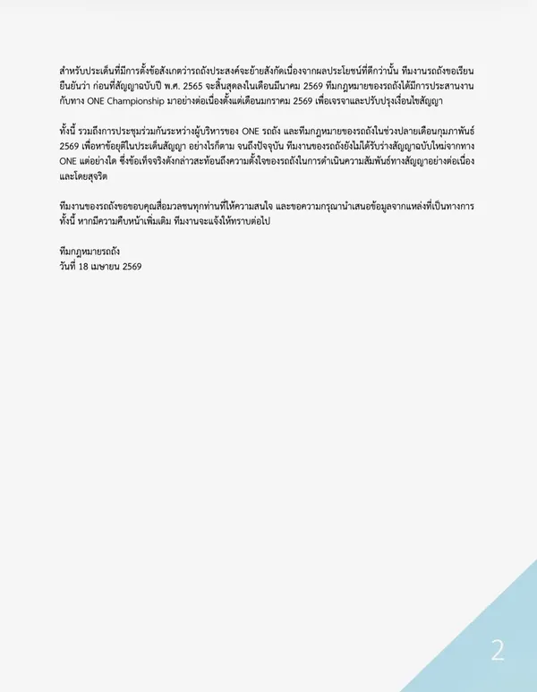 ทีมงานระบุเพิ่มเติมว่า เอกสารที่ได้รับเป็นเพียง “สำเนาสัญญา” ซึ่งส่งผ่านอีเมลเมื่อเดือนพฤศจิกายน 2568 และปรากฏเพียงลายมือชื่อของรถถังฝ่ายเดียว โดยยังไม่มีลายมือชื่อของกรรมการผู้มีอำนาจของ ONE Championship ส่งผลให้เกิดข้อกังวลเกี่ยวกับความสมบูรณ์และผลผูกพันทางกฎหมายของสัญญา รวมถึงประเด็นความคุ้มครองในกรณีเกิดเหตุไม่คาดคิดระหว่างการแข่งขัน