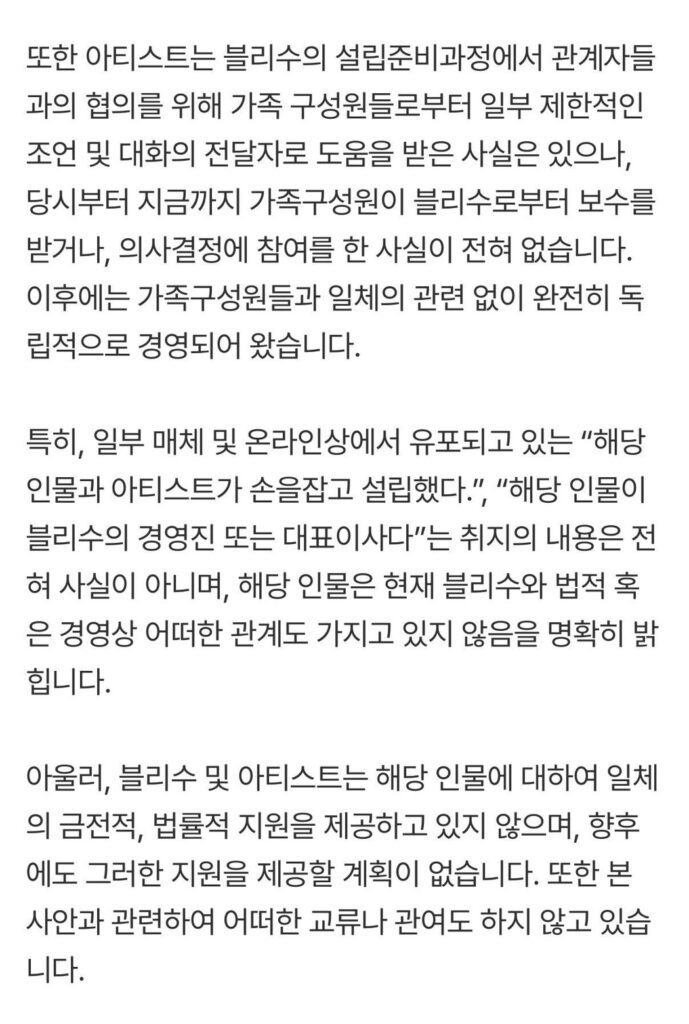 นอกจากนี้ ในช่วงเตรียมการก่อตั้ง BLISSOO ศิลปินเคยได้รับคำแนะนำและความช่วยเหลือในวงจำกัดจากสมาชิกในครอบครัว เช่น การช่วยประสานการสื่อสารระหว่างการหารือกับบุคคลที่เกี่ยวข้อง อย่างไรก็ตาม ไม่ว่าจะในอดีตหรือปัจจุบัน สมาชิกในครอบครัวไม่เคยได้รับค่าตอบแทนจาก BLISSOO และไม่ได้มีส่วนร่วมในการบริหารจัดการหรือการตัดสินใจใด ๆ ทั้งสิ้น นับตั้งแต่นั้นมา บริษัทได้ดำเนินงานอย่างเป็นอิสระโดยสมบูรณ์ ปราศจากการแทรกแซงจากสมาชิกในครอบครัว