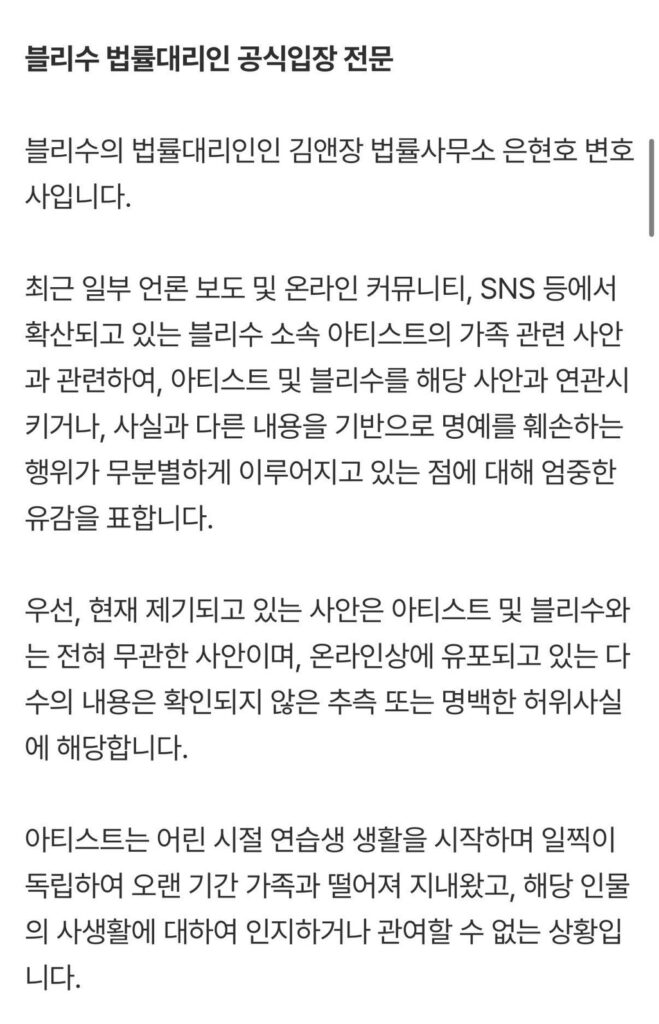 เราขอแสดงความกังวลอย่างยิ่งต่อการเผยแพร่ข้อมูลโดยปราศจากการตรวจสอบ ที่เชื่อมโยงศิลปินและ BLISSOO เข้ากับประเด็นส่วนบุคคลในครอบครัว รวมถึงการเผยแพร่ข้อมูลอันเป็นเท็จที่ส่งผลกระทบต่อชื่อเสียงของศิลปิน ผ่านสื่อบางส่วน ชุมชนออนไลน์ และโซเชียลมีเดีย