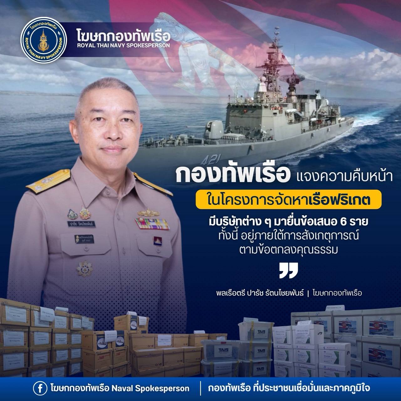 พลเรือตรี ปารัช รัตนไชยพันธ์ โฆษกกองทัพเรือ ชี้แจงความคืบหน้าการดำเนินโครงการจัดหาเรือฟริเกต ตามขั้นตอนการเชิญชวนบริษัทผู้มีศักยภาพและมีประสบการณ์ในการต่อเรือฟริเกตจากหลายประเทศ เข้ายื่นข้อเสนอ จำนวน 11 ราย บัดนี้ ครบกำหนดเวลาแล้ว มีบริษัทฯ เข้ายื่นข้อเสนอจำนวน 6 ราย ได้แก่
