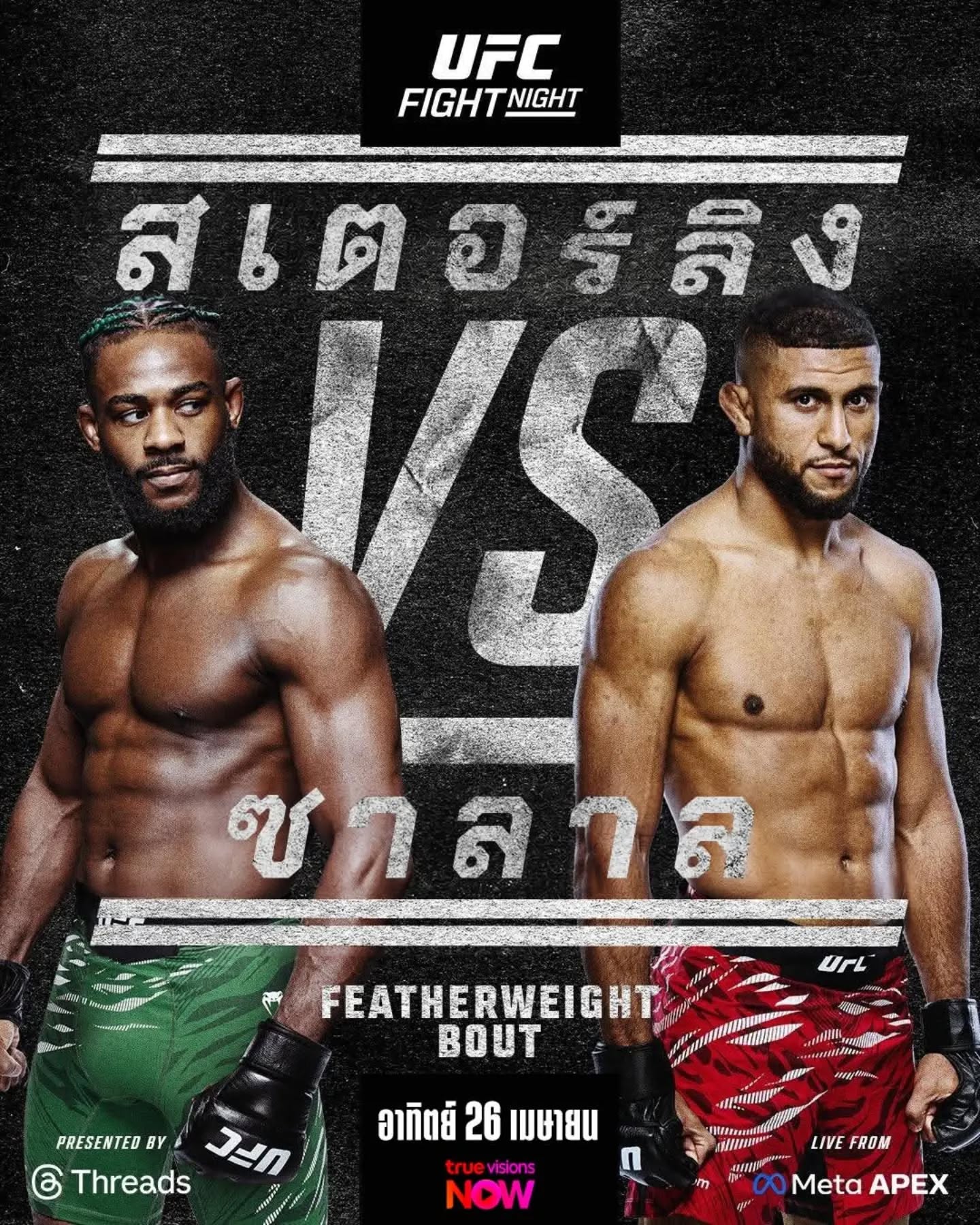 สำหรับการต่อสู้ภายใต้ศึก UFC FIGHT NIGHT : STERLING VS ZALAL จะระเบิดศึก ณ สังเวียน Meta Apex , ลาส เวกัส สหรัฐอเมริกา วันอาทิตย์ที่ 26 เมษายน นี้ คู่หลักของรายการเริ่มเวลา 07.00 น. ตามเวลาประเทศไทย