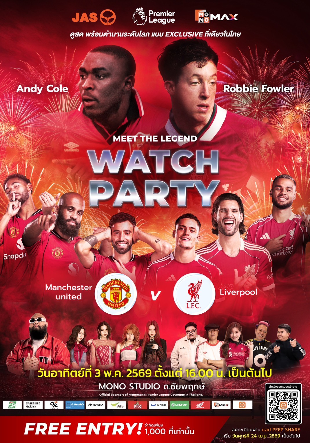 แฟนบอลชาวไทยเตรียมตัวให้พร้อมกับครั้งแรกที่ 2 ตำนานแดงเดือดจะปรากฏตัวพร้อมกันในประเทศไทย บริษัท จัสมิน อินเตอร์เนชั่นแนล จำกัด (มหาชน) หรือ JAS ผู้ถือลิขสิทธิ์ฟุตบอลพรีเมียร์ลีกอังกฤษ และเอมิเรตส์เอฟเอคัพอย่างเป็นทางการ ร่วมกับ Monomax แพลตฟอร์มหลักในการถ่ายทอดสดฟุตบอลพรีเมียร์ลีกและเอมิเรตส์เอฟเอคัพตลอด 6 ฤดูกาล ชวนแฟนผีและเด็กหงส์ร่วมสร้างประสบการณ์ลูกหนังสุดเอ็กซ์คลูซีฟครั้งใหญ่ในไทยและรวมพลังส่งเสียงเชียร์บิ๊กแมตช์แดงเดือด “MONOMAX WATCH PARTY: RED MATCH” ระหว่าง แมนเชสเตอร์ ยูไนเต็ด พบ ลิเวอร์พูล พร้อมกระทบไหล่ 2 ตำนานดาวยิงระดับโลก บินตรงร่วมเชียร์ติดขอบจอ ในวันอาทิตย์ที่ 3 พฤษภาคม 2569 ตั้งแต่เวลา 16.00 น. เป็นต้นไป ณ Mono Studio