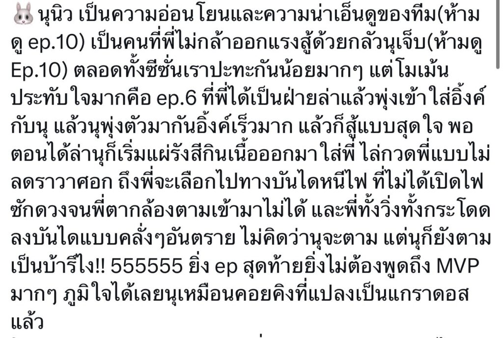 ล่าสุดทางด้าน “เต ตะวัน” หนึ่งในผู้แข่งขันรายการนี้ ก็เปิดใจบรรยายความรู้สึกต่อรายการและผู้เข้าแข่งขันรายการนี้ แต่สุดเอ็นดู ต้องยกให้ช่วงที่พูดถึง “นุนิว ชวรินทร์” ที่หนุ่ม “เต” เขียนว่า “🐰นุนิว เป็นความอ่อนโยนและความน่าเอ็นดูของทีม(ห้ามดู ep.10) เป็นคนที่พี่ไม่กล้าออกแรงสู้ด้วยกลัวนุเจ็บ(ห้ามดู Ep.10) ตลอดทั้งซีซั่นเราปะทะกันน้อยมากๆ แต่โมเม้นประทับใจมากคือ ep.6 ที่พี่ได้เป็นฝ่ายล่าแล้วพุ่งเข้าใส่อิ้งค์กับนุ แล้วนุพุ่งตัวมากันอิ้งค์เร็วมาก แล้วก็สู้แบบสุดใจ พอตอนได้ล่านุก็เริ่มแผ่รังสีกินเนื้อออกมาใส่พี่ ไล่กวดพี่แบบไม่ลดราวาศอก ถึงพี่จะเลือกไปทางบันไดหนีไฟ ที่ไม่ได้เปิดไฟซักดวงจนพี่ตากล้องตามเข้ามาไม่ได้ และพี่ทั้งวิ่งทั้งกระโดดลงบันไดแบบคลั่งๆอันตราย ไม่คิดว่านุจะตาม แต่นุก็ยังตาม เป็นบ้ารึไง!! 555555 ยิ่ง ep สุดท้ายยิ่งไม่ต้องพูดถึง MVP มากๆ ภูมิใจได้เลยนุเหมือนคอยคิงที่แปลงเป็นแกราดอสแล้ว”