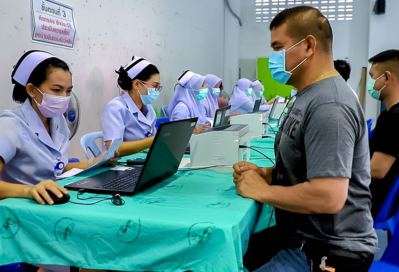 บุคลากรทางการแพทย์ เจ้าหน้าที่ด่านหน้า นราธิวาส ทยอยฉีดวัคซีนซิโนแวค ลอต 4 จำนวน 541 ราย ขณะตั้งจุดตรวจซักประวัติ