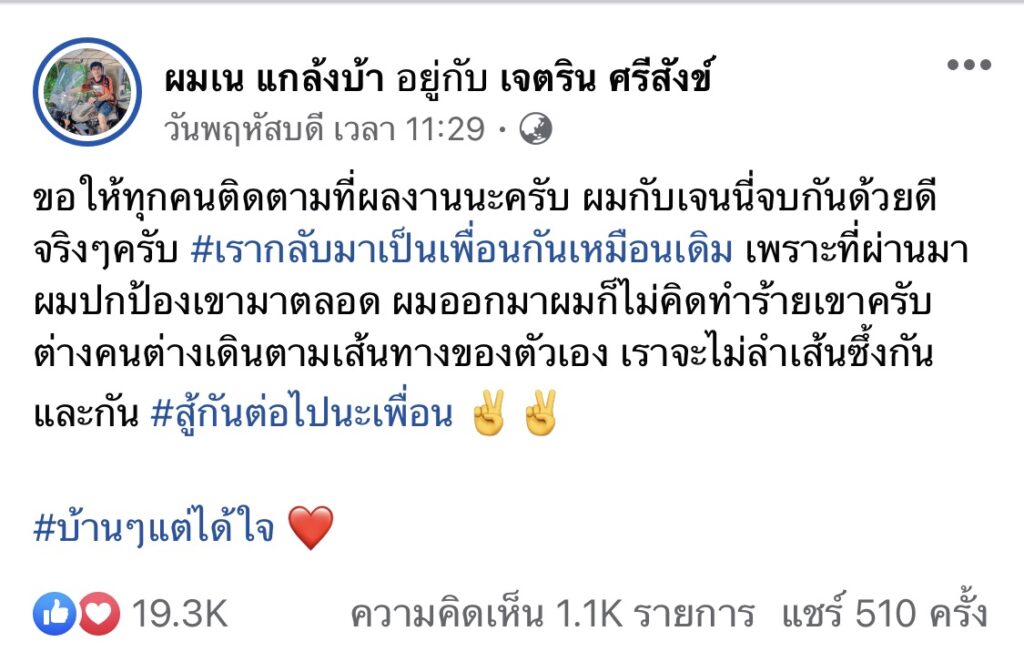 โดยล่าสุด หนุ่มเนเงิน อดีตหวานใจของสาวเจนนี่ ก็ได้มีการโพสต์เฟซบุ๊ค ระบุว่า “ขอให้ทุกคนติดตามที่ผลงานนะครับ ผมกับเจนนี่จบกันด้วยดีจริงๆครับ #เรากลับมาเป็นเพื่อนกันเหมือนเดิม เพราะที่ผ่านมาผมปกป้องเขามาตลอด ผมออกมาผมก็ไม่คิดทำร้ายเขาครับ ต่างคนต่างเดินตามเส้นทางของตัวเอง เราจะไม่ลำเส้นซึ้งกันและกัน #สู้กันต่อไปนะเพื่อน #บ้านๆแต่ได้ใจ”