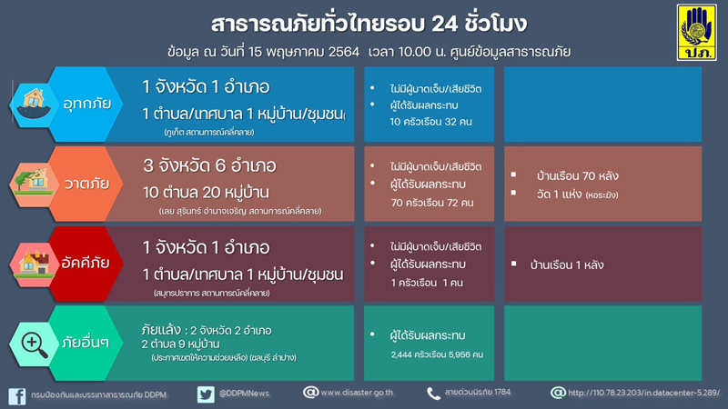 ขณะที่ในรอบสัปดาห์ระหว่างวันที่ 10-15 พ.ค. 64 เวลา 06.00 น. มีพื้นที่ประสบวาตภัย 17 จังหวัด 38 อำเภอ 56 ตำบล 109 หมู่บ้าน บ้านเรือนเสียหาย 862 หลัง