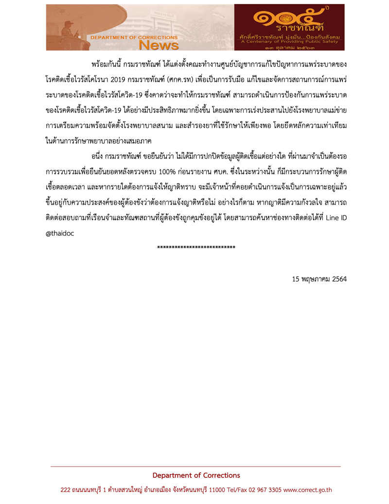 กรมราชทัณฑ์ ขอเรียนว่ายอดผู้ติดเชื้อที่พบในเวลานี้ สืบเนื่องจากการเร่งตรวจเชิงรุกในผู้ต้องขังแบบ 100% ซึ่งสอดคล้องกับนโยบายของกระทรวงสาธารณสุข และสำนักงานหลักประกันสุขภาพแห่งชาติ (สปสช.) ในการบับเบิ้ลแอนด์ซีลทั่วประเทศ อีกทั้งความสามารถในการตรวจหาเชื้อที่ดำเนินการได้ในปริมาณมากขึ้น จากการสนับสนุนของสำนักงานสาธารณสุขในพื้นที่ โรงพยาบาลแม่ข่าย รวมถึงหน่วยงานต่างๆ ที่ได้ร่วมตรวจหาเชื้อด้วยวิธี RT-PCR เพื่อแยกกลุ่มเป้าหมายที่ติดเชื้อและกลุ่มที่ยังไม่ติดเชื้อออกจากกัน จนสามารถตรวจแล้วเสร็จ 100% ในระยะเวลารวดเร็ว ก่อนที่จะรายงานข้อมูลทั้งหมดไปยังศูนย์บริหารสถานการณ์การแพร่ระบาดของโรคติดเชื้อไวรัสโคโรนา 2019 หรือ ศบค.