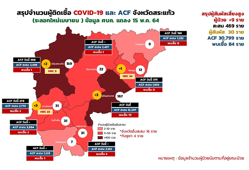 ทำให้การระบาดระลอกใหม่เมษายน 2564 ตั้งแต่วันที่ 4 เมษายน-14 พฤษภาคม 2564 จังหวัดสระแก้วมีผู้ป่วยสะสมทั้งสิ้น 469 ราย เข้ารักษาตัวอยู่ในสถานพยาบาลของรัฐ เอกชน และโรงพยาบาลสนามรวมทั้งสิ้น 123 ราย รักษาหายแล้ว 343 ราย