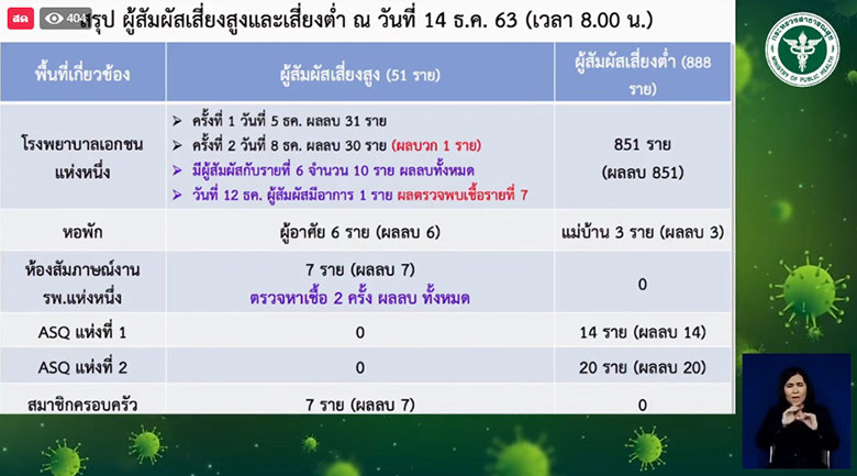 นพ.โอภาส การย์กวินพงศ์ อธิบดีกรมควบคุมโรค พร้อม นพ.จักรรัฐ พิทยาวงศ์อานนท์ ผอ.กองยุทธศาสตร์และแผนงาน กรมควบคุมโรค แถลงสถานการณ์ผู้ติดเชื้อโควิด-19 ในประเทศไทย ประจำวันที่ 15 ธ.ค. 63 ระบุว่า สถานการณ์การติดเชื้อในประเทศ กรณีการติดเชื้อในสถานกักกันทางเลือก(ASQ)ไม่ใช่การติดเชื้อในรพ. โดยพบเป็นการติดเชื้อในกลุ่มที่ใช้ชีวิตประจำวันร่วมกัน แบบวงจำกัด ล่าสุด จากการสอบสวนโรค และตรวจผู้สัมผัสเสี่ยงสูง และ เสี่ยงต่ำ ขณะนี้ยังไม่พบว่ามีผู้ติดเชื้อเพิ่ม ยอดผู้ติดเชื้อคงที่ ที่ 7 ราย