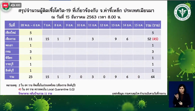 ขณะเดียวกัน นพ.โอภาส ยังระบุถึงกรณีที่มีผู้ที่เดินทางมาจากจ.ท่าขี้เหล็ก ประเทศเมียนมา ระบุว่า ปัจจุบันพบผู้ติดเชื้อโควิด-19 ที่เดินทางกลับมาจาก จ.ท่าขี้เหล็ก ประเทศเมียนมา สะสมในประเทศไทย 64 คน จำนวนนี้พบว่า 45 คน ประสานขอเข้ารับการกักตัวตามระบบของรัฐ สำหรับจ.เชียงราย
