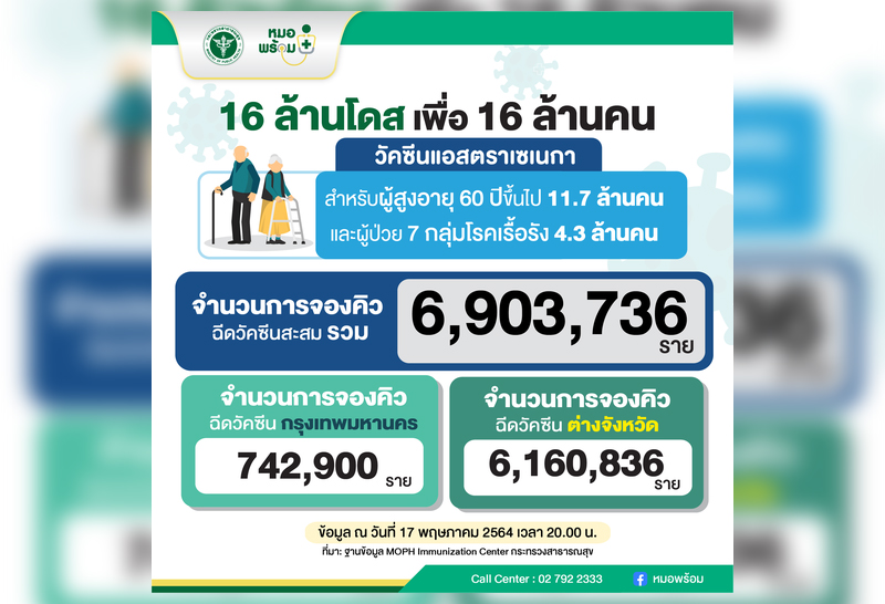 เพจหมอพร้อม รายงานความคืบหน้าการจองคิวฉีดวัคซีนโควิด-19 ของกลุ่มผู้สูงอายุ 60 ปีขึ้นไป 11.7 ล้านคน และผู้ป่วย 7 กลุ่มโรคเรื้อรัง 4.3 ล้านคน ตามจำนวนของวัคซีนที่จะได้รับจาก แอสตราเซเนกา ในช่วงเดือนมิ.ย.เป็นต้นไป จำนวน 16 ล้านโดส