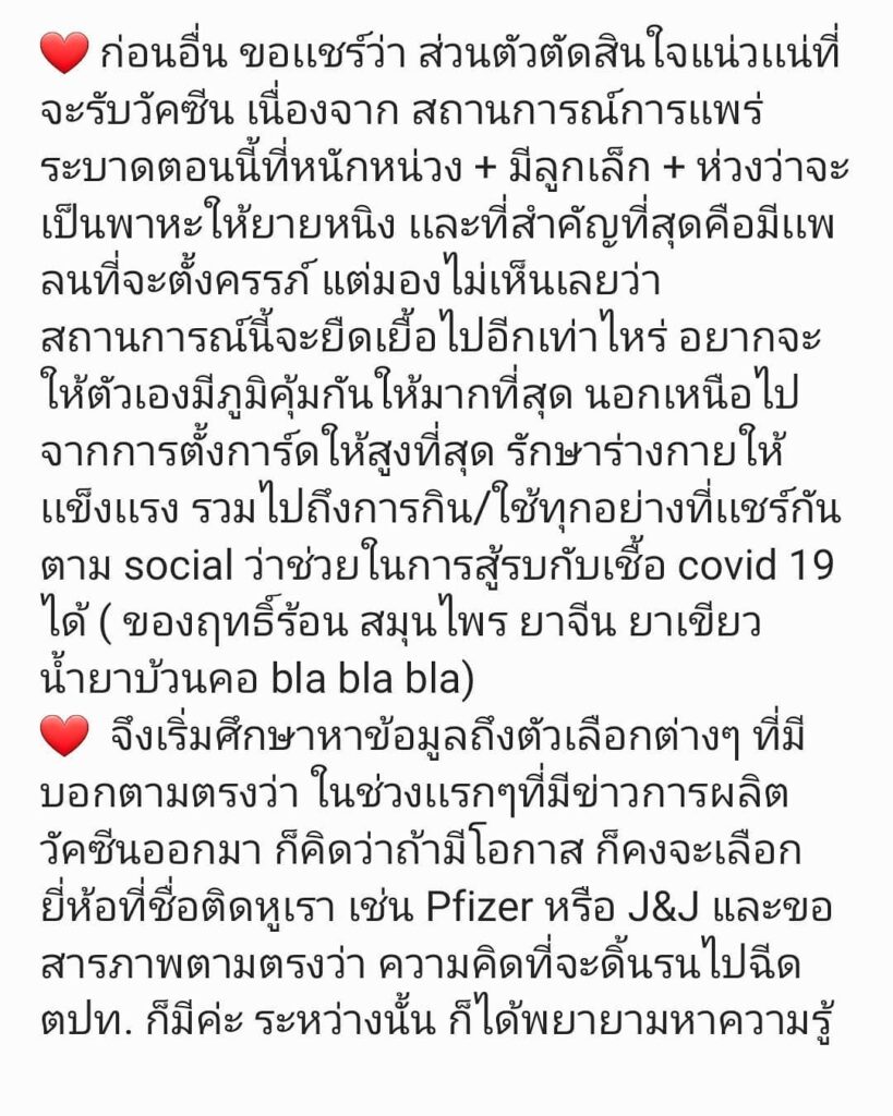 โดยชมพู่ ได้เผยว่าสาเหตุที่ตัดสินใจเข้ารับการฉีดวัคซีน เนื่องจากมีลูกเล็ก มีคุณแม่ที่อายุค่อนข้างเยอะ และยังทีแพลนที่จะตั้งครรภ์ลูกคนต่อไป จึงอยากจะเซฟตัวเองและทุกคนในครอบครัวประกอบกับยังมองไม่เห็นว่าสถานการณ์การแพร่ระบาดของเชื้อไวรัสโควิด-19 นี้จะยืดเยื้อไปนานเท่าไหร่ ดังนั้นจึงเริ่มศึกษาหาข้อมูลต่างๆเกี่ยวกับวัคซีนแต่ละยี่ห้อและผลข้างเคียง และตัดสินใจเข้ารับการฉีดวัคซีนโดยไม่ลังเลตั้งแต่วันที่ 9 พฤษภาคมที่ผ่านมา ซึ่งตอนนี้อาการทุกอย่างยังปกติ ไม่ได้มีผลข้างเคียงอะไร พร้อมเผยเคารพการตัดสินใจของทุกคน