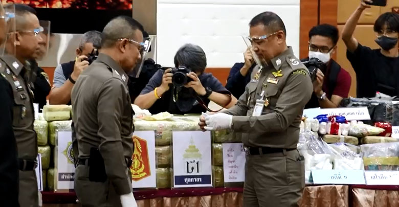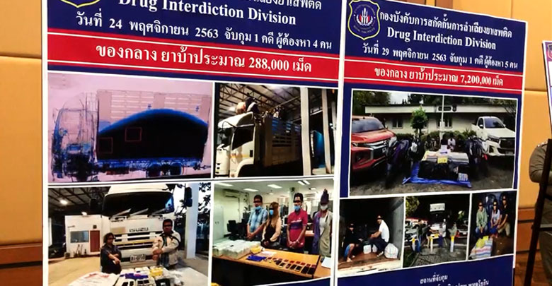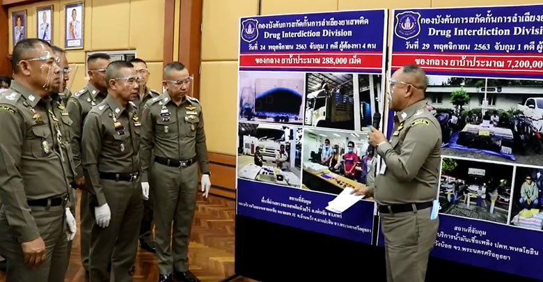 พล.ต.อ.มนู เมฆหมอก รองผู้บัญชาการตำรวจแห่งชาติ นำแถลงผลจับกุมขบวนการค้ายาเสพติดรายสำคัญ ตั้งแต่วันที่ 24 พฤศจิกายนที่ผ่านมา – กลางเดือนธันวาคม ที่แยกลำเลียงใน 8 พื้นที่ ได้แก่ จ.เชียงราย จ.พระนครศรีอยุธยา จ.เพชรบุรี จ.สมุทรปราการ เขตพญาไท เขตบางนา กรุงเทพมหานคร และ จ.อุดรธานี โดยมีรายที่น่าสนใจ คือ รายแรกจับกุมผู้ต้องหา 4 คน เมื่อ 24 พฤศจิกายน พร้อมของกลางยาบ้า 288,000 เม็ด จับกุมได้ที่ ริมถนนสายเอเชีย หมายเลข 32 ต.บ้านหว้า อ.บางปะอิน จ.พระนครศรีอยุธยา ซึ่งพฤติการณ์ลำเลียงยา พบว่า นำยาซุกซ่อนในกระสอบปุ๋ย และนำขึ้นรถบรรทุก สำหรับขนสินค้าการเกษตรไปส่งลูกค้าที่อยู่ในภาคกลาง อีกราย จับกุม เมื่อ 29 พฤศจิกายน ได้ผู้ต้องหา 9 ราย ของกลางเป็นยาบ้า 7,200,000 เม็ด พฤติการณ์พบว่า ผู้ต้องหาที่อยู่ใน จ.นครพนม ใช้รถบรรทุก 6 ล้อ รับจ้างขนส่ง จากผู้ว่าจ้างพื้นที่ชายแดนภาคตะวันออกเฉียงเหนือ ไปส่งมอบให้กับลูกค้าอยู่ในภาคกลาง สำหรับภาพรวมสรุป ผลปฏิบัติการใน 8 พื้นที่ รวบผู้ต้องหาได้ 23 คน ดำเนินไป 10 คดี ยึดของกลางเป็นยาบ้า 12,888,000 เม็ด ไอซ์ 20 กิโลกรัม กัญชา 604 กิโลกรัม เคตามีย 10 กิโลกรัม เฮโรอีน 2 กิโลกรัม และฝิ่น 4 กิโลกรัม โดยในแต่ละพื้นที่ ตำรวจปราบปรามยาเสพติด ยังคงขยายผลการจับกุมต่อไป