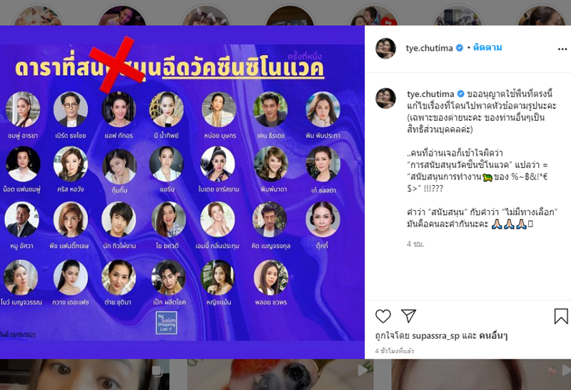 ออกมาเคลียร์หลังติดลิสต์รายชื่อดาราที่เข้ารับการฉีดวัคซีนป้องกันโควิด และถูกโยงว่าสนับสนุนรัฐบาล สำหรับต่าย – ชุติมา ซึ่งเจ้าตัวขอใช้พื้นที่ในอินสตาแกรมส่วนตัวเพื่อชี้แจงกับเรื่องดังกล่าว หลังถูกโจมตีหนัก วอนให้เข้าใจไหม้ว่า “คำว่าสนับสนุน กับ คำว่า ไม่มีทางเลือก มันคือคนละคำกัน”