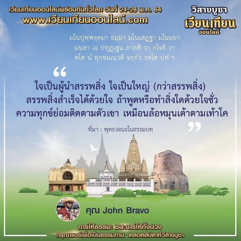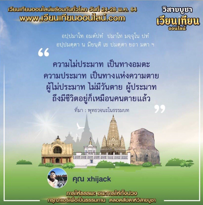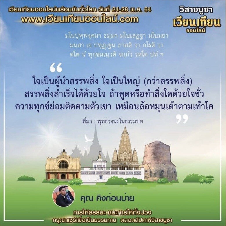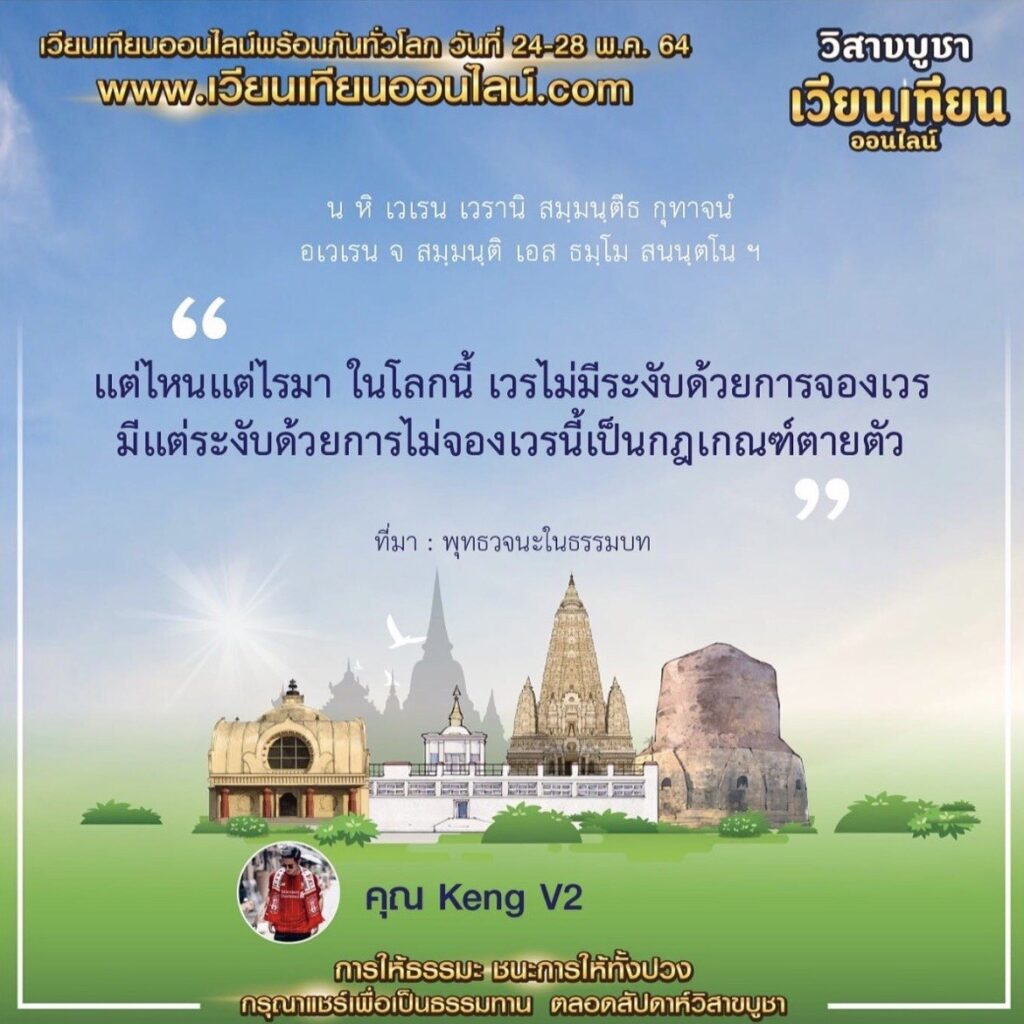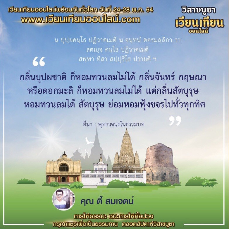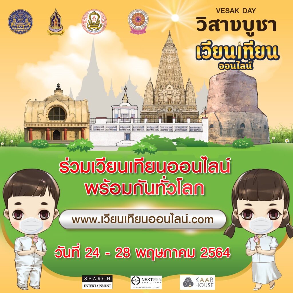 พุทธศาสนิกชนทุกท่านสามารถร่วมกิจกรรมวิสาขบูชาเวียนเทียนออนไลน์ที่เว็บไซต์ www.เวียนเทียนออนไลน์.com ได้ตั้งแต่วันที่ 24 – 28 พฤษภาคม 2564 นี้