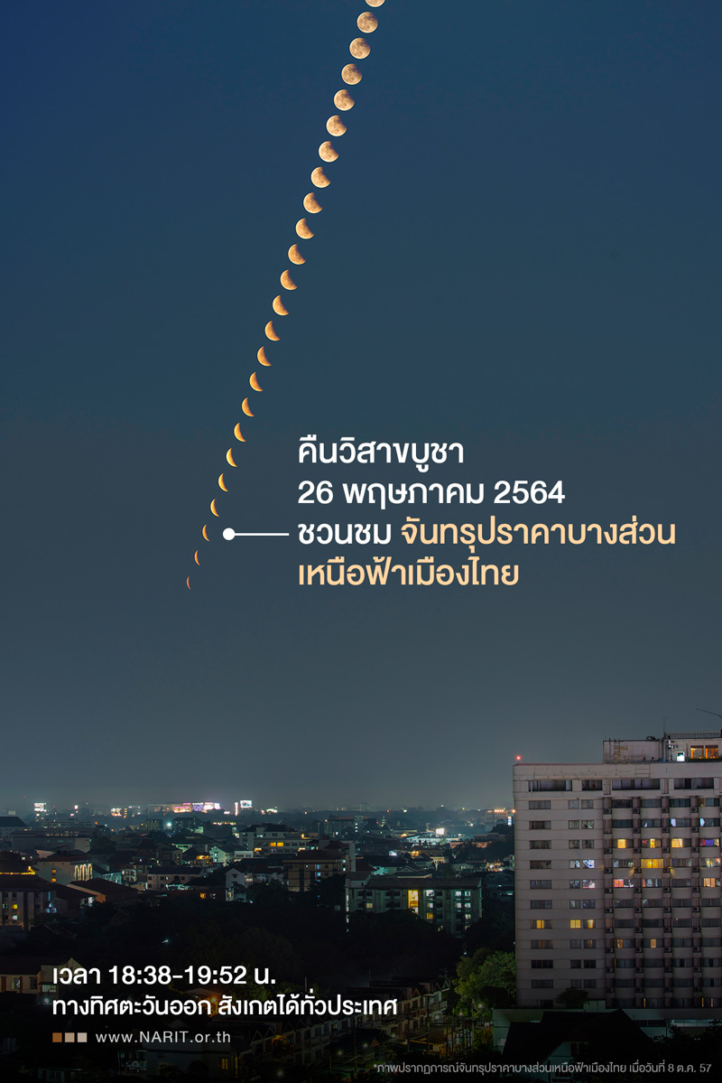 นายศุภฤกษ์ คฤหานนท์ หัวหน้างานบริการวิชาการดาราศาสตร์ สดร. เปิดเผยว่า ปรากฏการณ์จันทรุปราคาเต็มดวงในวันที่ 26 พฤษภาคม 2564 นั้น ตรงกับวันวิสาขบูชา ดวงจันทร์เริ่มเข้าสู่เงามัวของโลกตั้งแต่เวลา 15.47 น. จากนั้นค่อย ๆ เคลื่อนเข้าสู่เงามืดของโลก เกิดเป็นจันทรุปราคาบางส่วนในเวลา 16.44 น. และเข้าสู่จันทรุปราคาเต็มดวงตั้งแต่เวลา 18.11-18.25 น. แต่ในวันดังกล่าว ในประเทศไทยดวงจันทร์จะโผล่พ้นจากขอบฟ้าเวลาประมาณ 18.38 น. ทำให้ผู้สังเกตในไทยมีโอกาสมองเห็นเป็นเพียง “จันทรุปราคาบางส่วน” เท่านั้น