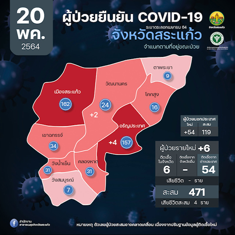 นพ.ประภาส ผูกดวง นายแพทย์สาธารณสุขจังหวัดสระแก้ว เปิดเผยว่า วันนี้ (20 พฤษภาคม 64) จังหวัดสระแก้วมีผู้ติดเชื้อรายใหม่จากในจังหวัดทั้งหมด 6 ราย และมีผู้ที่ติดเชื้อจากต่างประเทศเข้ามา 54 ราย (จากช่องทางธรรมชาติ 7 ราย และขออนุญาตเข้ามาผ่านจุดผ่านแดนถาวรบ้านคลองลึก 47 ราย) รวมผู้ติดเชื้อทั้งหมด 60 ราย มาจากระบบเฝ้าระวังในโรงพยาบาล การตรวจคัดกรองเชิงรุก และกลุ่มเสี่ยงสูงที่สัมผัสกับผู้ป่วยยืนยัน เป็นเพศชาย 30 ราย หญิง 30 ราย อายุระหว่าง 18 – 43 ปี อำเภอที่พบผู้ติดเชื้อ ได้แก่ อำเภออรัญประเทศ 6 ราย ทำให้การระบาดระลอกใหม่เมษายน ตั้งแต่วันที่ 4 เมษายน-19 พฤษภาคม 2564 จังหวัดสระแก้วมีผู้ป่วยสะสมทั้งสิ้น 471 ราย ติดเชื้อจากต่างประเทศ 119 ราย เข้ารักษาตัวอยู่ในสถานพยาบาลของรัฐ เอกชน และโรงพยาบาลสนามรวมทั้งสิ้น 207 ราย รักษาหายแล้ว 379 ราย