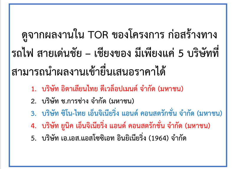ทั้งนี้ ดูจากผลงานในทีโออาร์ของโครงการก่อสร้างทางรถไฟ สายเด่นชัย-เชียงของ มีเพียงแค่ 5 บริษัทที่สามารถนำผลงานเข้ายื่นเสนอราคาได้คือ