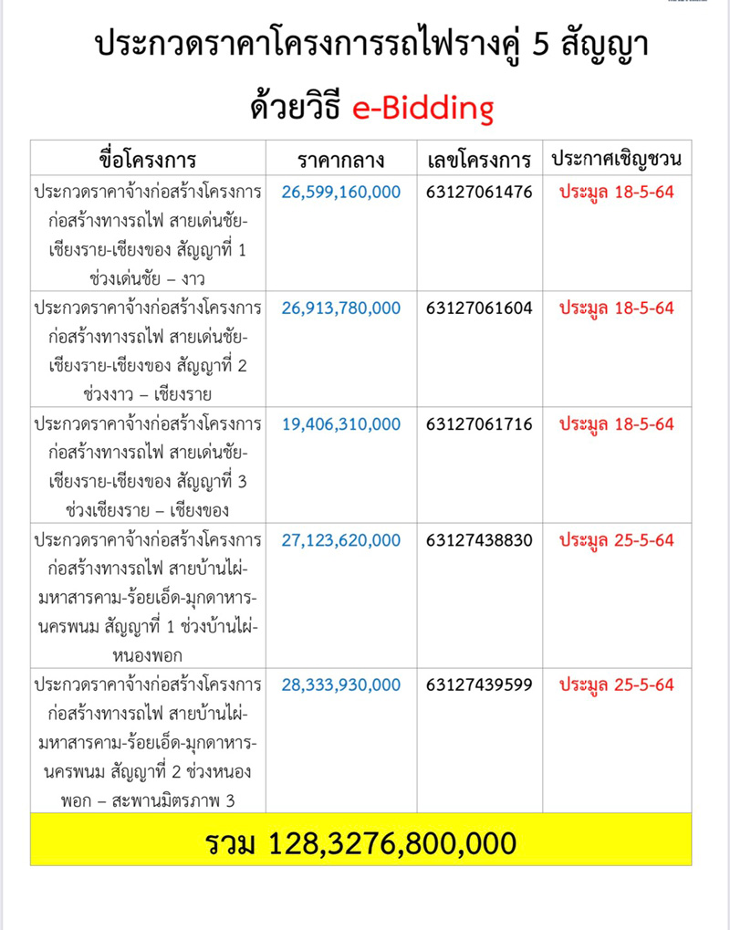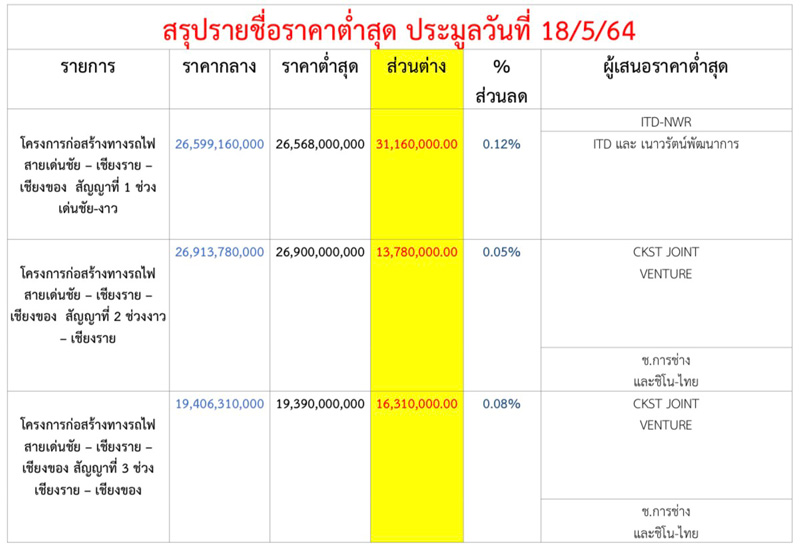โดยการเปิดประมูลครั้งนี้มีขั้นตอนตามกฎหมาย มีผู้ซื้อซองประมูล 18-16 ราย ในการประมูลแต่ละสัญญา แต่ที่น่าตั้งข้อสังเกตคือ พอถึงวันยื่นประมูลจะเหลือเพียงแค่ 2 บริษัทเท่านั้น และที่น่าสงสัยคือ ราคาประมูลในแต่ละสัญญาที่มีราคาใกล้เคียงกับราคากลาง เช่น โครงการสายเด่นชัย-เชียงราย-เชียงของ ราคากลางอยู่ที่ 26,599,160,000 บาท แต่ปรากฏว่าผู้ยื่นราคาต่ำสุดอยู่ที่ 26,568,000,000 บาท ต่างกันเพียง 0.12% เท่านั้น ในส่วนสายเด่นชัย-เชียงราย-เชียงของ ราคากลางอยู่ที่ 26,913,780,000 บาท ผู้ยื่นราคาต่ำสุด 26,900,000,000 บาท และสายเด่นชัย-เชียงราย-เชียงของ ราคากลางอยู่ที่ 19,406,310,000 บาท ผู้ยื่นราคาต่ำสุด 19,390,000,000 บาท ต่างกัน 0.08% ถือว่าเป็นการเสนอราคาที่ไร้เทียมทาน