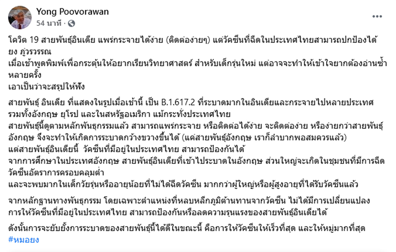 ศ.นพ.ยง ภู่วรวรรณ หัวหน้าศูนย์เชี่ยวชาญเฉพาะทางด้านไวรัสวิทยาคลินิก คณะแพทยศาสตร์ จุฬาลงกรณ์มหาวิทยาลัย โพสต์ในเพจเฟสบุ๊ก”Yong Poovorawan” ระบุ โควิด-19 สายพันธุ์อินเดีย แพร่กระจายได้ง่าย (ติดต่อง่ายๆ) แต่วัคซีนที่ฉีดในประเทศไทยสามารถปกป้องได้ โดยสายพันธุ์ อินเดีย ที่แสดงในรูปเมื่อเช้านี้ เป็น B.1.617.2 ที่ระบาดมากในอินเดียและกระจายไปหลายประเทศ รวมทั้งอังกฤษ ยุโรป และในสหรัฐอเมริกา แม้กระทั่งประเทศไทย สายพันธุ์นี้ดูตามหลักพันธุกรรมแล้ว สามารถแพร่กระจาย หรือติดต่อได้ง่าย จะติดต่อง่าย หรือง่ายกว่าสายพันธุ์อังกฤษ จึงจะทำให้เกิดการระบาดกว้างขวางขึ้นได้ (แค่สายพันธุ์อังกฤษ เราก็ลำบากพอสมควรแล้ว) แต่สายพันธุ์อินเดียนี้ วัคซีนที่มีอยู่ในประเทศไทย สามารถป้องกันได้