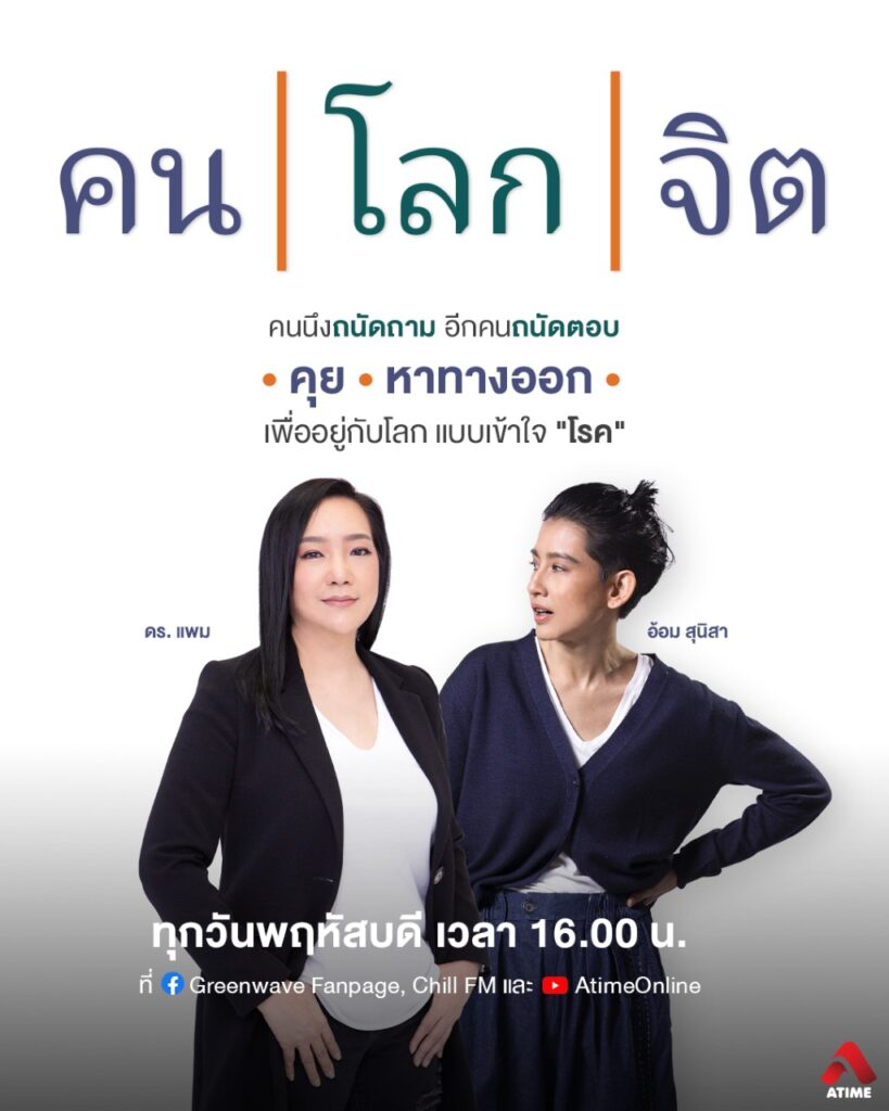 “นี่คือรายการ คน โลก จิต รายการที่อ้อมอยากจะชวนคุณให้มารู้จักกับ โรค และเข้าใจ โลก ช่วยให้คุณเรียนรู้พฤติกรรมของตัวเองและผู้อื่น เพื่อให้เราอยู่ในโลกนี้อย่างสบายกายสบายใจกันขึ้น มีอ้อม คนถนัดถาม รับหน้าที่ตั้งคำถามจากปัญหาสุขภาพจิตใกล้ต้ว และมี ดร.ปรมา มุทิตาภรณ์ หรือ ดร.แพม (Psy.D.) ผู้เชี่ยวชาญด้านจิตวิทยา เป็นคนถนัดตอบ มานั่งเล่าให้ฟังถึงวิธีสังเกตตัวเราเองง่ายๆ และวิเคราะห์คนอื่นอย่างเข้าใจ อย่าง EP1 เรายกเคสของการ กลัวโควิด จนจิตตก หลายคนเป็นกันอยู่ใช่ไหมคะ แล้วที่เป็นอยู่นี่ เข้าขั้นอาการ PARANOID DISORDER แล้วหรือยัง อ้อมชวนทุกคนมาเช็คอาการ ว่าเรากลัวโควิด จนจิตป่วยกันหรือยัง แล้วถ้าเราเครียดกับมันมากจะมีวิธีจัดการกับมันอย่างไร มาดูกันค่ะ คน โลก จิต ทุกวันพฤหัสบดี เวลา 16.00 น. “ที่ Facebook : Greenwave fanpage , Chill FM และทาง YOUTUBE : AtimeOnline ค่ะ” อ้อม สุนิสา สุขบุญสังข์ กล่าว