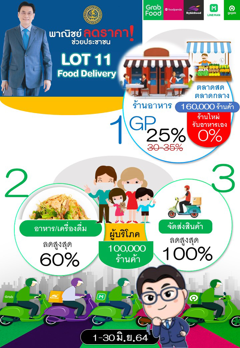 นายจุรินทร์ ลักษณวิศิษฏ์ รองนายกรัฐมนตรี และรัฐมนตรีว่าการกระทรวงพาณิชย์ เปิดเผยว่า กระทรวงพาณิชย์ได้ทำโครงการ “พาณิชย์ลดราคาช่วยประชาชน” Lot11 (Food Delivery) ซึ่งได้เชิญผู้เกี่ยวข้องมาหารือเพื่อให้ความช่วยเหลือร้านอาหาร โดยมีแพลตฟอร์มสั่งอาหารออนไลน์ 5 แพลตฟอร์ม ตัวแทนร้านอาหาร กำหนดมาตรการเพื่อช่วยสนับสนุนร้านอาหารในภาวะวิกฤต โดยกลุ่มผู้ประกอบการร้านอาหารที่ขายผ่านแพลตฟอร์ม จะได้ลดค่า GP ที่ร้านอาหารต้องจ่ายจากเฉลี่ยร้อยละ 25-35 ลงมาเหลือร้อยละ 25 ทั้งหมด