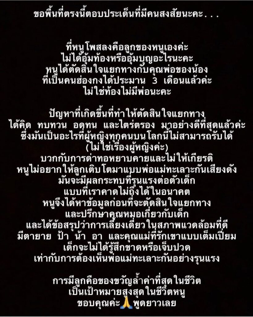 โดยภายหลัง น้ำตาล ได้ออกมาชี้แจงถึงเรื่องกระแสข่าวดังกล่าวว่า รูปที่โพสต์เป็นลูกชายของตนจริง ไม่ได้อุ้มท้องหรืออุ้มบุญ และตัดสินใจแยกทางกับสามีชาวฮ่องกงได้ 3 เดือนแล้ว ไม่ใช่ท้องไม่มีพ่อ ซึ่งเหตุผลที่ตัดสินใจแยกทางได้คิดทบทวน อดทนและไตร่ตรองเป็นอย่างดี ยันไม่เกี่ยวกับเรื่องผู้หญิง แต่เป็นเรื่องของการด่าทอหยาบคายและไม่ให้เกียรติกัน หวั่นว่าจะส่งผลกรระทบกับลูกในอนาคต จึงได้หาข้อมูลและจัดสินใจแยกทางกัน