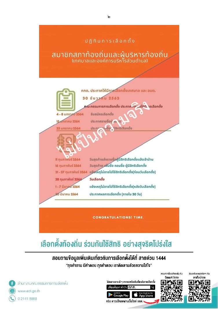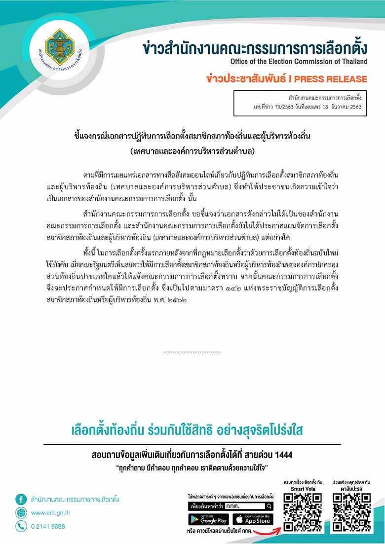 สำนักงานคณะกรรมการการเลือกตั้ง (กกต.) เผยแพร่เอกสารตามที่มีสื่อสังคมออนไลน์ลงข้อมูลเกี่ยวกับปฏิทินการเลือกตั้ง สมาชิกสภาท้องถิ่นและผู้บริหารท้องถิ่น (เทศบาลและองค์การบริหารส่วนตำบล) ซึ่งทำให้ประชาชนเกิดความเข้าใจว่า เป็นเอกสารของสำนักงานคณะกรรมการการเลือกตั้ง นั้น